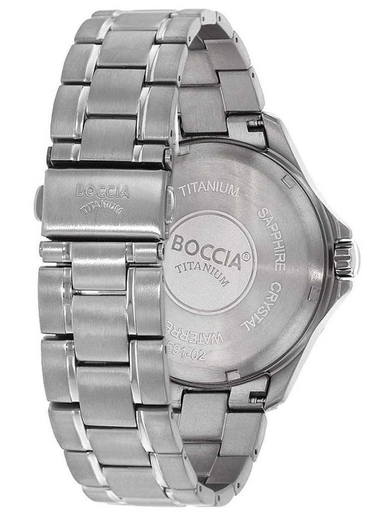 Pánske hodinky Boccia Titanium 3591-03 majú okrúhle titánové puzdro, ktoré drží na ruke vďaka kvalitne spracovanému titánovému strojčeku. Ciferník, ktorý obsahuje ukazovateľ dátumu, je chránený zafírovým sklíčkom. Hodinky sú vodotesné do 10 atmosfér.