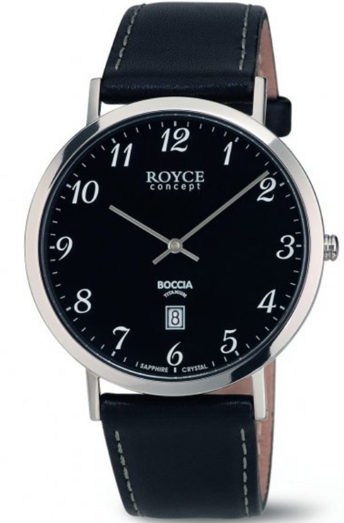 Pánske hodinky Boccia Titanium 3634-02 patria do modelového radu ROYCE. Hodinky majú okrúhle titánové puzdro a na zápästí ich drží kožený remienok.