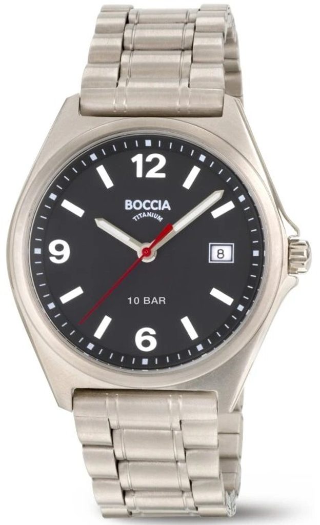 Pánske hodinky Boccia Titanium 3663-01 majú okrúhle titánové puzdro, na ktoré nadväzuje titánový náramok so skladacou sponou. Športovo-elegantný čierny ciferník ďalej dopĺňa ukazovateľ dátumu na pozícii 3 hodín.
