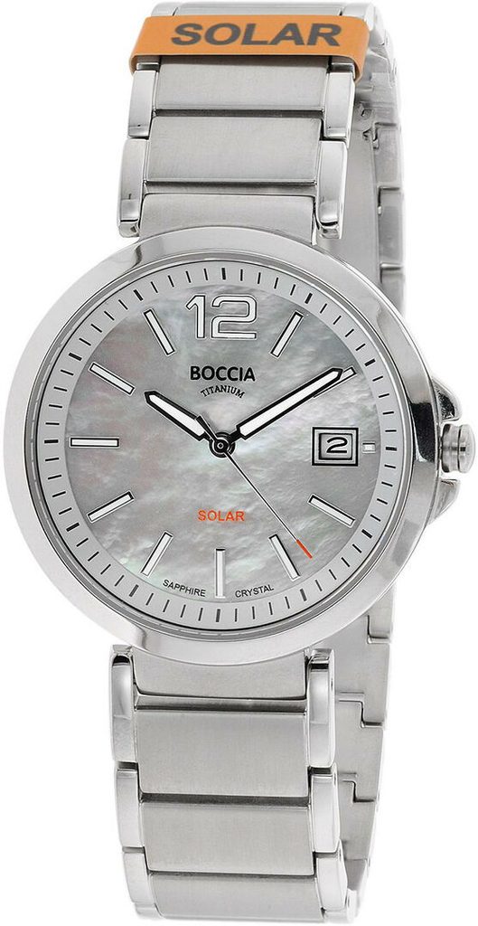 Dámske hodinky Boccia Titanium Solar 3332-01 disponujú okrúhlym titánovým puzdrom. Hodinky skvele držia na ruke vďaka titánovému náramku. Športovo-elegantný ciferník je navyše doplnený o ukazovateľ dátumu na klasickej pozícii 3. hodiny.