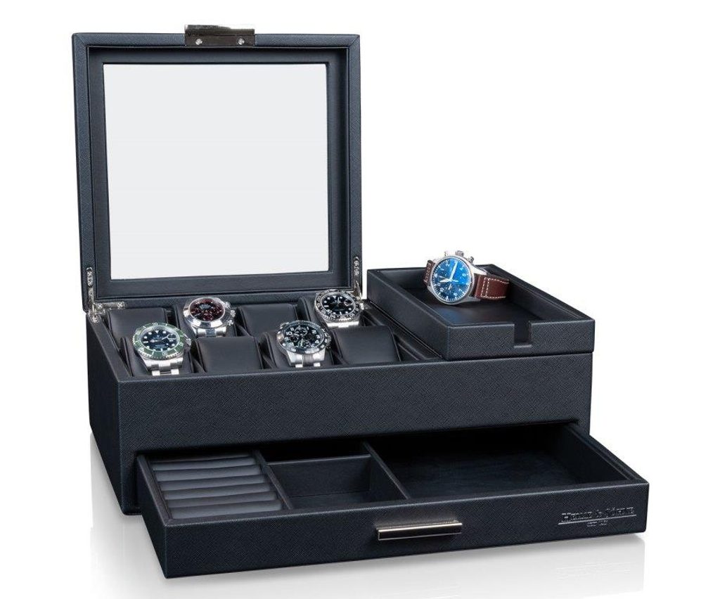 Do hornej časti úložného boxu možno uložiť až osem hodiniek, mobilný telefón alebo menšie cennosti. V spodnej časti je priestor na uloženie prsteňov, manžetových gombíkov, retiazok a iných drobných predmetov.