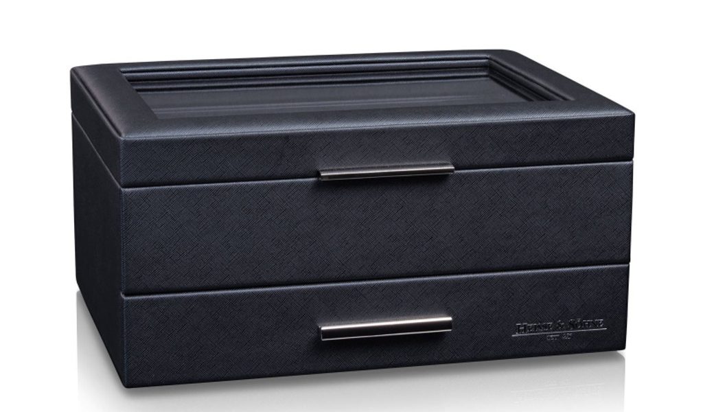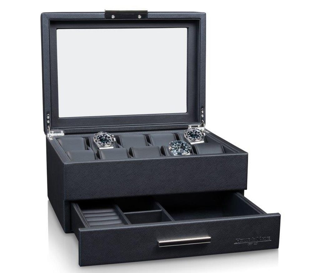 Box na hodinky a šperky Heisse & Söhne Heron 10+ 70019-190.142 je mimoriadne elegantný a praktický na uloženie šperkov a hodiniek. Krabička je potiahnutá kvalitnou, robustnou imitáciou kože so vzhľadom Saffiano. Vnútro je vystlané mäkkou, vysokokvalitnou imitáciou kože, ktorá uchováva hodinky a doplnky v bezpečí.
