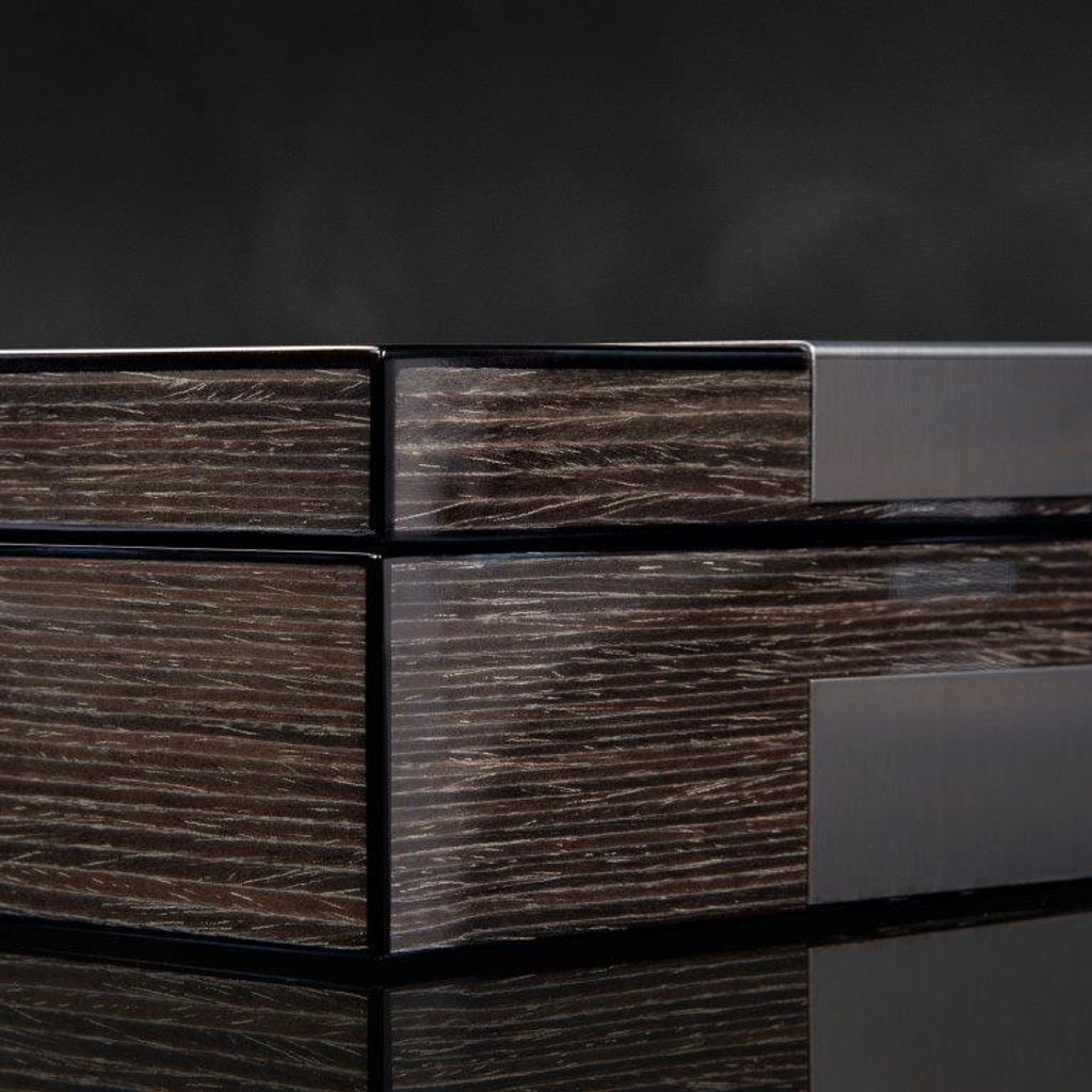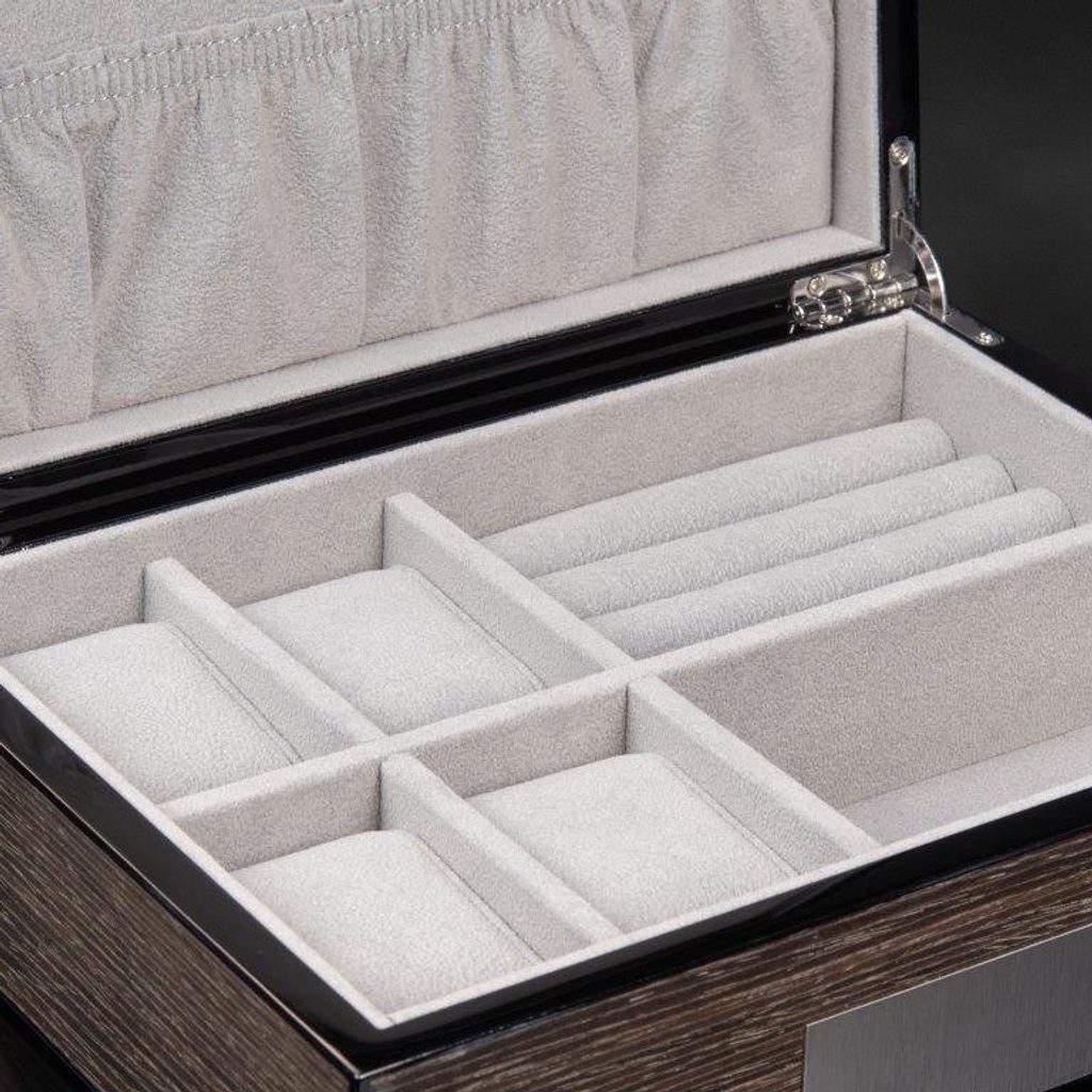 Box na hodinky a šperky Heisse & Söhne Leo 4 70019-193.164 na 4 hodinky a iné cennosti. Box na hodinky a šperky zo série Leo spája nadčasovú eleganciu a maximálnu funkčnosť vo výnimočnom dizajne. Tmavá dyha Ginko dodáva krabičke luxusný, prírodný vzhľad, zatiaľ čo svetlosivý interiér vytvára fascinujúci kontrast a štýlovo dotvára dizajn.