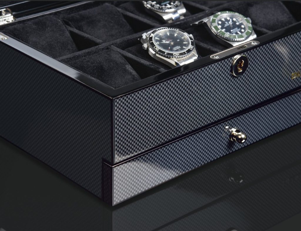 Designhütte Chicago 8+ 70005-06 box na 8 hodiniek. Puzdrá na hodinky zo série Chicago zaujmú svojím športovo elegantným dizajnom a dynamickým vzhľadom. Vysoko lesklá povrchová úprava v karbónovom vzhľade, inšpirovaná pretekárskym dizajnom, dodáva boxom štýlový vzhľad. Chrómovaný zámok nielenže zaisťuje bezpečnosť, ale zároveň podčiarkuje vysokokvalitné vyhotovenie.