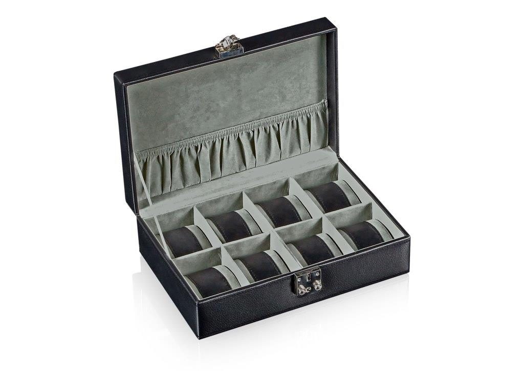 Puzdro na hodinky Designhütte Solid 8 70005-129 pre 8 hodiniek. Puzdrá na hodinky Solid ponúkajú ideálne riešenie na štýlové a bezpečné uloženie hodiniek doma aj na cestách. Vysokokvalitná imitácia kože s bielym alebo čiernym ozdobným prešívaním dodáva puzdrám sofistikovaný a elegantný vzhľad.