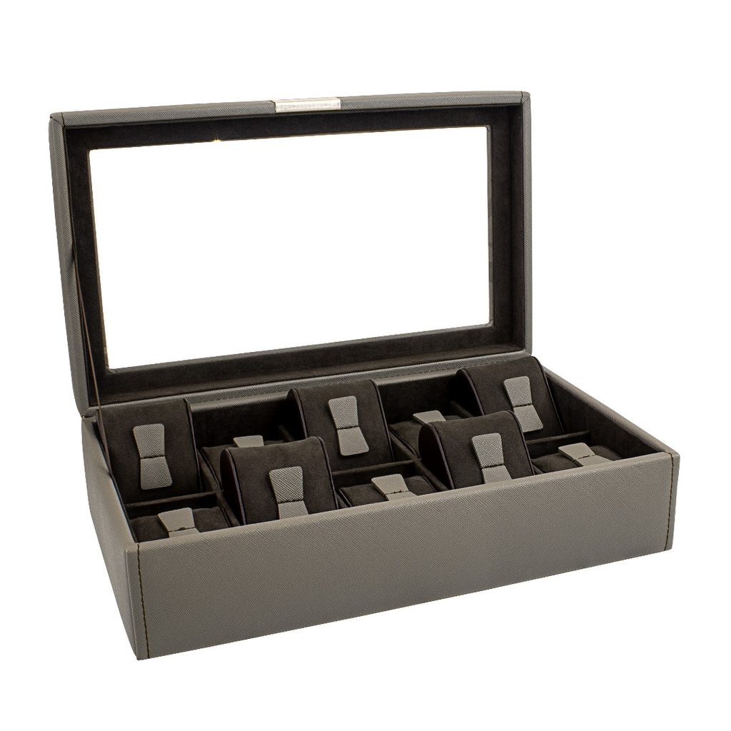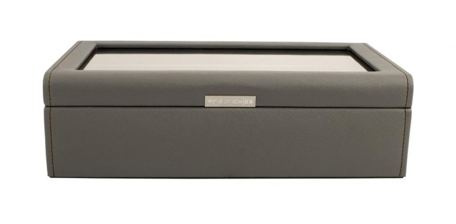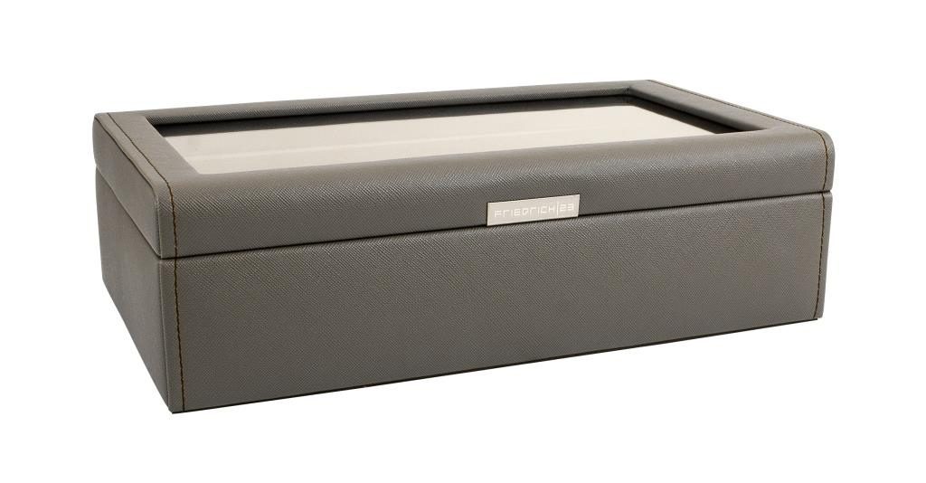 Elegantný box na hodinky Friedrich Lederwaren Bond 20113-3 s priehľadným vekom na 10 hodiniek. Vyrobené z tmavosivého syntetického materiálu s tmavým semišovým vnútrom.