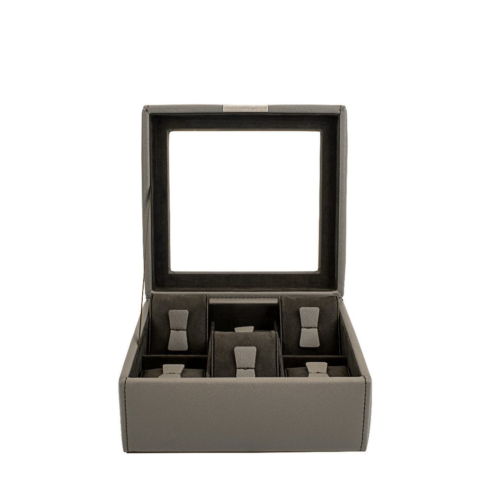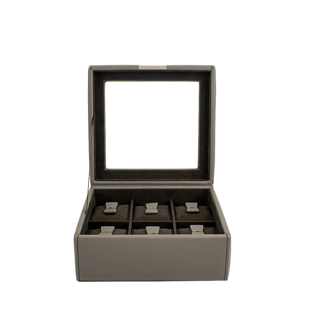 Elegantný box na hodinky Friedrich Lederwaren Bond 20114-3 s priehľadným vekom na 6 hodiniek. Vyrobené z tmavosivého syntetického materiálu s tmavým semišovým vnútrom.