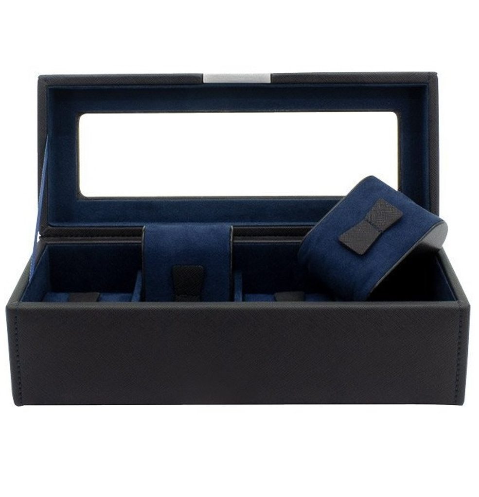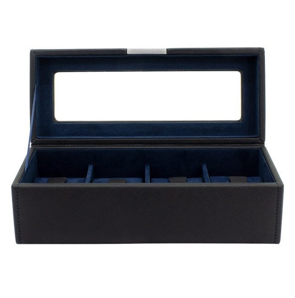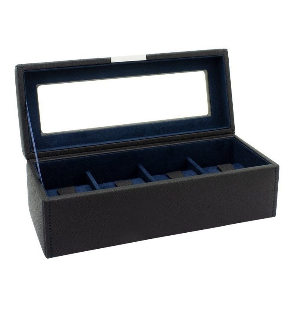 Elegantný box na hodinky Friedrich Lederwaren Bond 20115-2 s priehľadným vekom na 4 hodinky. Je vyrobená z čierneho syntetického materiálu s tmavomodrým semišovým vnútrom.
