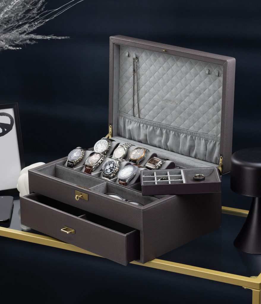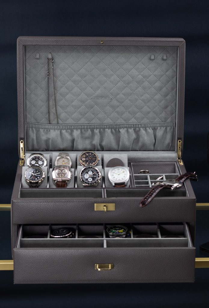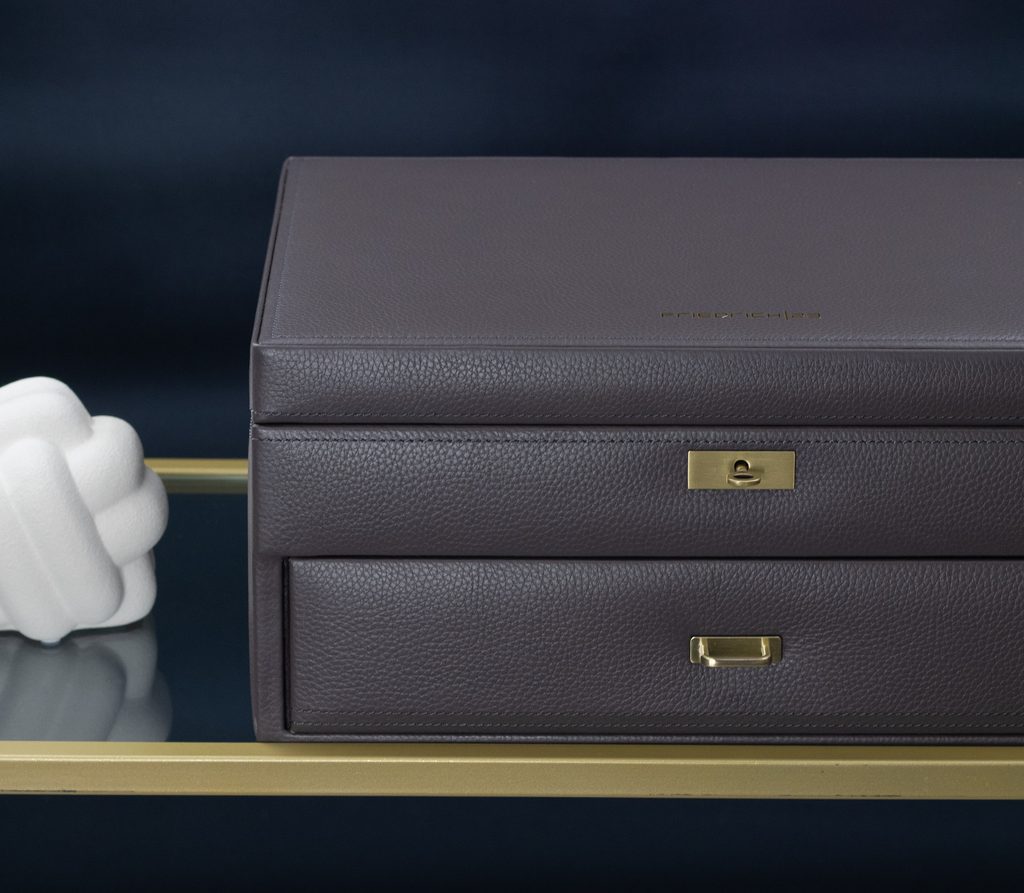 Exkluzívna schránka Friedrich Lederwaren Dynasty 27035-9 z modelového radu Dynasty, ktorý bol vytvorený pri príležitosti 40. výročia značky Friedrich 23. Je to uzamykateľná schránka na hodinky, smart hodinky, šperky a okuliare. Základňa je vyrobená z MDF dreva, ktoré je potiahnuté kvalitnou kožou v sivej farbe. Do schránky možno uložiť až 20 hodiniek, obsahuje tiež 2 priehradky na okuliare, vyberateľnú priehradku na manžetové gombíky s priestorom na uloženie prsteňov alebo spony na kravatu a ďalšiu priehradku pod ňou na iné cennosti.