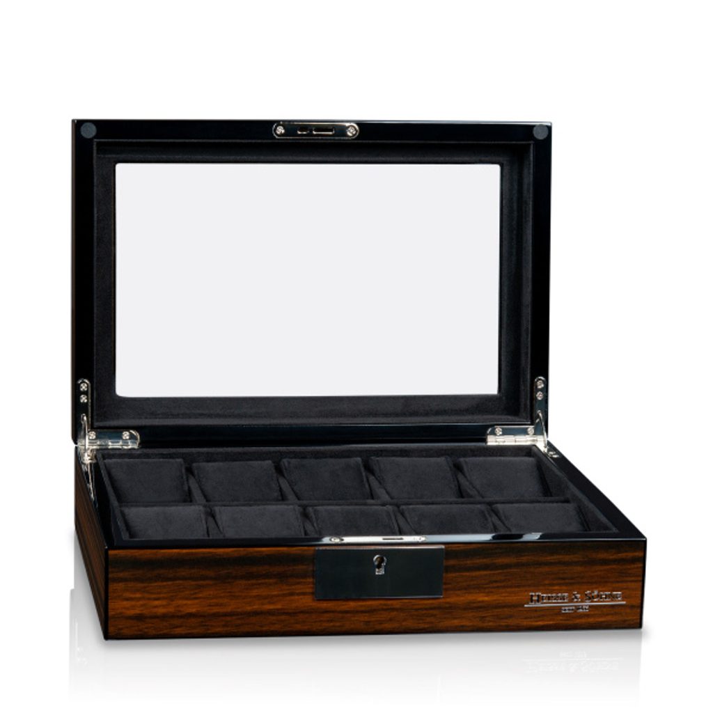 Krabička na hodinky Heisse & Söhne Tenor 70019-196.159 na 10 hodiniek. Krabičky na hodinky Tenor sú dokonalým riešením pre milovníkov hodiniek, ktorí chcú bezpečne a štýlovo uložiť svoje cenné hodinky. Vďaka dômyselnému zapustenému sklenenému okienku si môžete hodinky kedykoľvek prezrieť bez toho, aby ste museli puzdro otvárať.