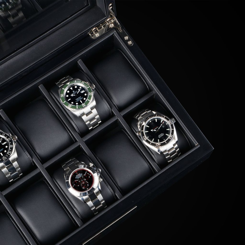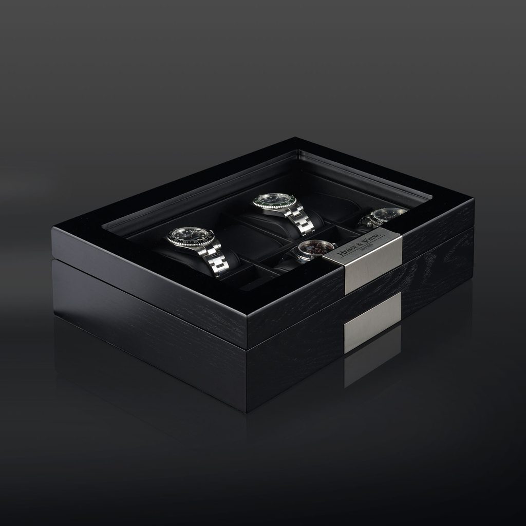 Elegantný box na hodinky Heisse & Söhne Executive Monteray 10 70019-108 na 10 hodiniek so skleneným vekom. Vyrobený z čiernej drevenej dyhy, so semišovým interiérom a kovovými detailmi na veku.