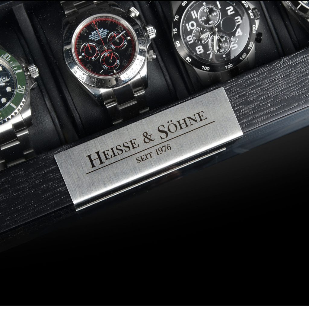 Elegantný box na hodinky Heisse & Söhne Executive Monteray 10 70019-107 na 5 hodiniek so skleneným vekom. Je vyrobený z čiernej drevenej dyhy so semišovým interiérom a kovovými detailmi na veku.