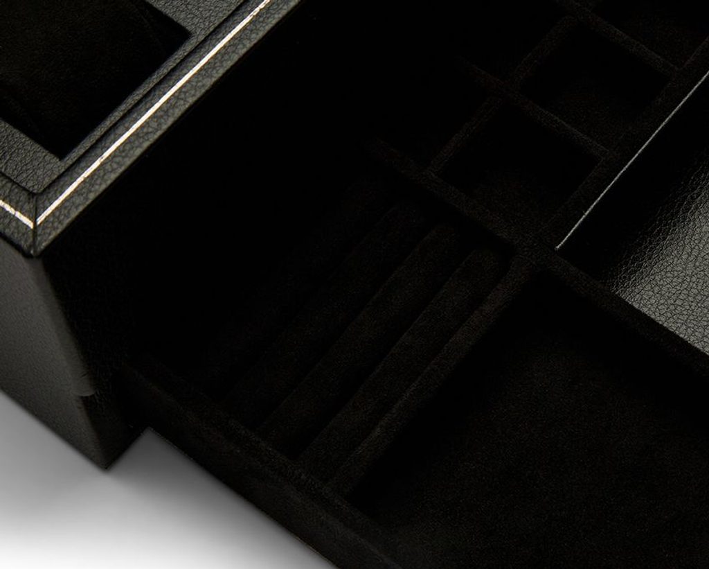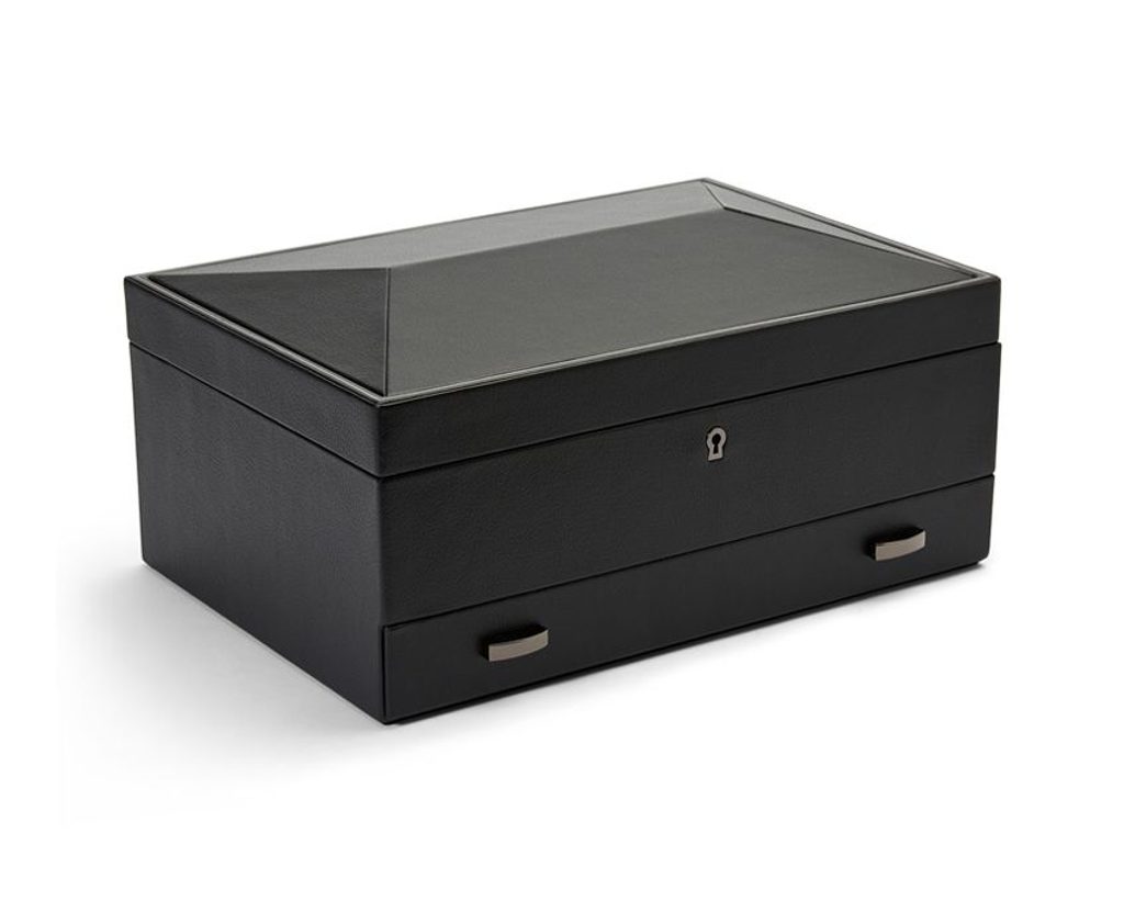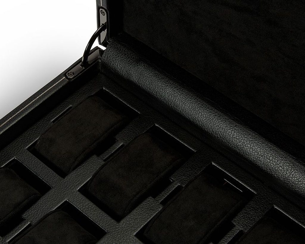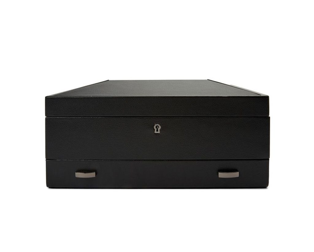Wolf British Racing Black 792802 je veľmi dobre vyrobená škatuľa z jemnej textúrovanej kože a zamatovej podšívky s uzamykateľným vekom. Môžete do nej bezpečne uložiť 10 hodiniek. Krabička má aj vstup pre kábel na prípadné nabíjanie inteligentných hodiniek. V spodnej časti sa nachádza zásuvka na manžetové gombíky, prstene a iné hodinky.