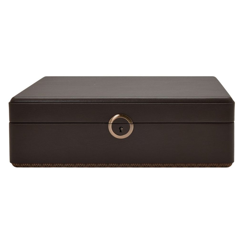 Box ponúka úložný priestor na 5 hodiniek, odnímateľné plato s priehradkami na ďalšie cennosti a odnímateľné okrúhle vrecko na zips.