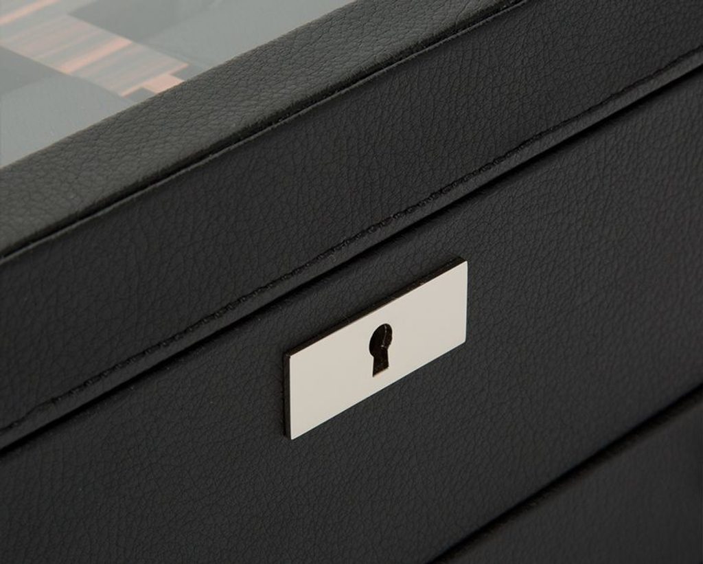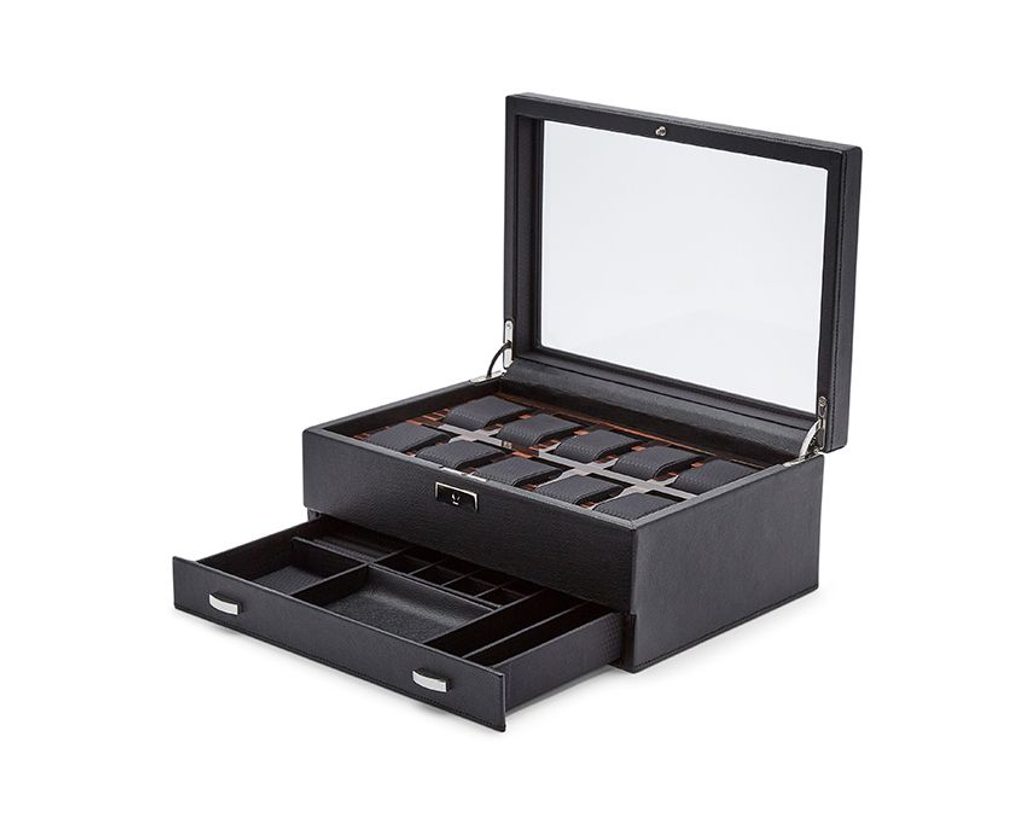 Inšpirované najlepšími britskými automobilmi, Jaguar, Aston Martin, Bristol a podobne. Wolf Roadster 477656 box so skleneným vekom na 10 hodiniek potiahnutý vegánskou kožou s detailmi z ebenového makasaru s lešteným drevom. Spodná výsuvná časť obsahuje ďalšie priehradky rôznych veľkostí na šperky a doplnky.