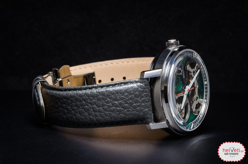 Neprehliadnuteľným prvkom hodiniek je ich číselník tvorený priehľadom na strojček. Obvod číselníka tvorí okružie s minútovým značením. Číselník je ladený do čiernozelenej farby. Číselník chráni vypuklé zafírové sklíčko. Puzdro hodiniek je vyrobené z nerezovej ocele a dopĺňa ho šedočierny kožený remienok s rovnako sfarbeným prešitím. Priemer puzdra hodiniek je 43,5 mm. Vodotesnosť hodiniek je, vzhľadom na ich určenie, dostačujúcich 50 m.