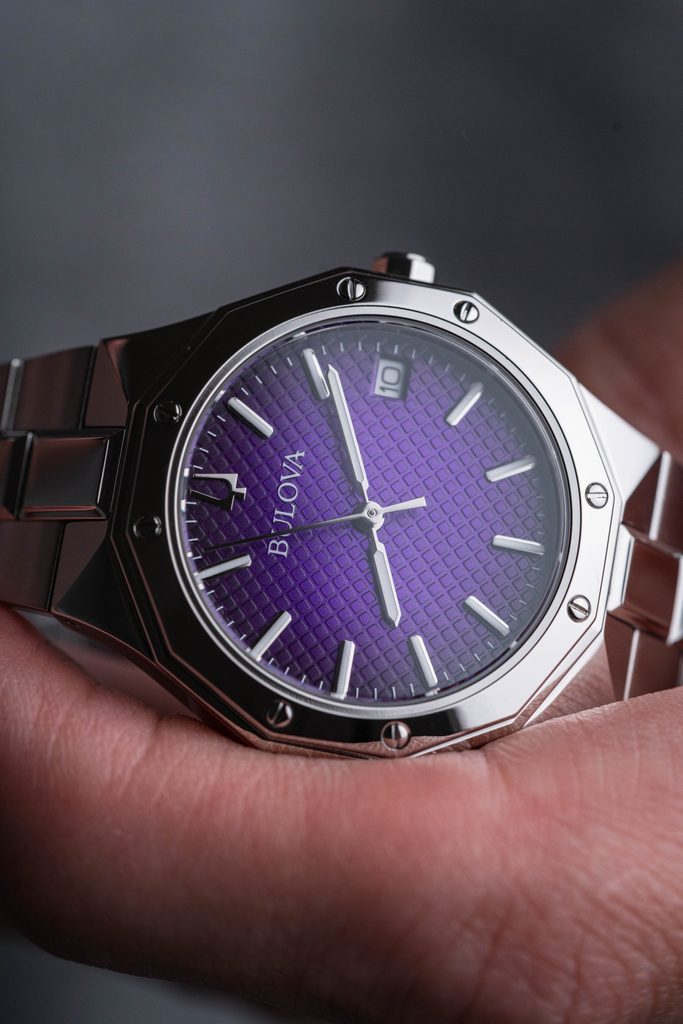 Na priehľadnom fialovom ciferníku vyniknú striekačkové ručičky a aplikované indexy na hodinových pozíciách. Chráni ho antireflexné zafírové sklíčko, ktoré je odolné proti poškriabaniu a ľahko čitateľné aj na priamom svetle. Ručičky a indexy hodiniek sú luminiscenčné, čo uľahčuje čítanie času pri slabom osvetlení. Hodinky sú vybavené ukazovateľom dátumu na pozícii 3 hodín.