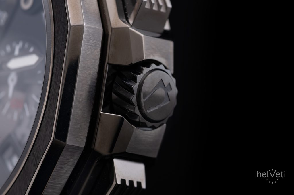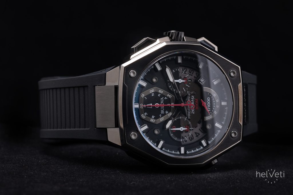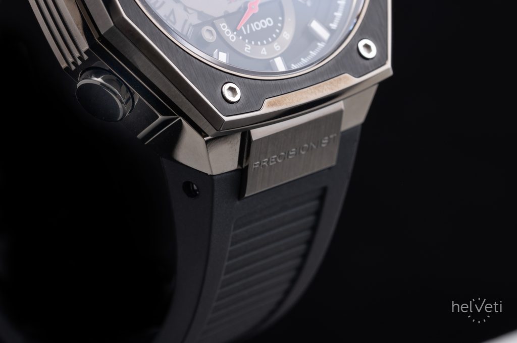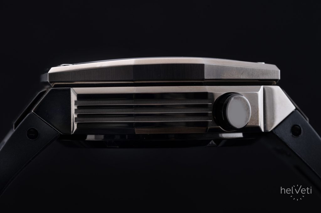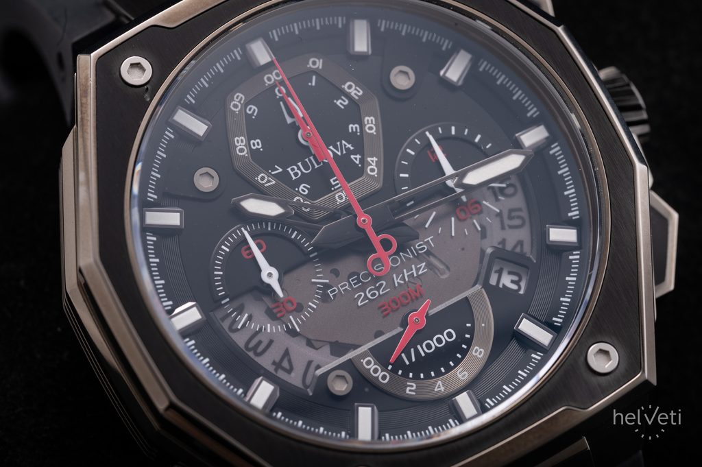 Oceľové puzdro s PVD úpravou povrchu zaujme svojim netradičným oktagonálnym tvarom. Model je poháňaný vysokofrekvenčným batériovým strojčekom UHF (Ultra High Frequency), pracujúcim na frekvencii 262 kHz. To je zhruba 8x viac, než u bežných quartzových strojčekov (32768 Hz). Vďaka tomu je možné dosiahnuť extrémnu presnosť chodu s odchýlkou približne 10s za rok! Zaujímavosťou je aj plynulý chod sekundovej ručičky aj napriek tomu, že sa jedná o quartzový strojček. Na tradičnej pozícii 3 potom nájdeme aj ukazovateľ dátumu. Zaujímavosťou je čiastočný priehľad, ktorý nám odhaľuje pohľad pod číselník na dátový disk. Z ďalších funkcií nemôžeme zabudnúť na stopky s presnosťou 1/1000 sekundy a plynulým chodom sekundovej ručičky. Stopky merajú čas v dĺžke až 12-tich hodín.
