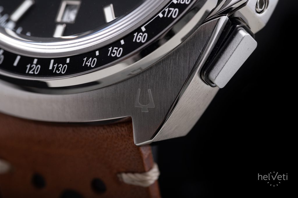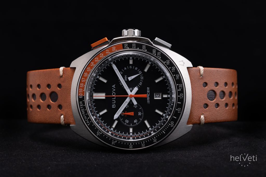 Oceľové puzdro hodiniek inšpirované aerodynamikou automobilov dopĺňa hnedý kožený remienok v pretekárskom štýle s rýchloupínacím systémom. Model je vybavený ukazovateľom dátumu, 24-hodinovým časom a stopkami. Stopky, ktoré dokážu merať až hodinové intervaly s presnosťou na 1/1 sekundy, sa ovládajú tlačidlami na bočnej strane puzdra - horným sa stopky spúšťajú a zastavujú, spodným sa meranie vynuluje. Zobrazenie 24-hodinového času sa potom nachádza na subciferníku na pozícii 3 hodín.