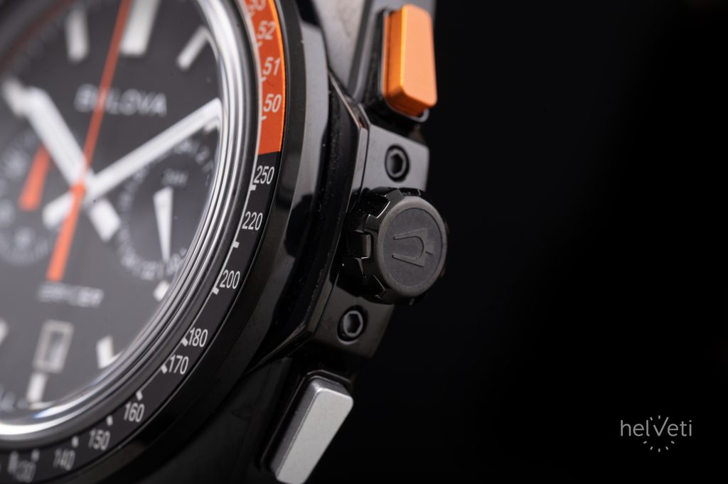 Športový štýl dotvára luneta s tachymetrickou stupnicou, použitý remienok a celkový čierny dizajn doplnený oranžovými prvkami. Ciferník s výraznými luminiscenčnými ručičkami a indexmi chráni zafírové sklíčko s vnútornou antireflexnou vrstvou. Hodinky poháňa batériový strojček Miyota 0S21. Priemer puzdra je ideálnych 42 mm pre väčšinu pánskych zápästí. Vodotesnosť hodiniek je 100 m.