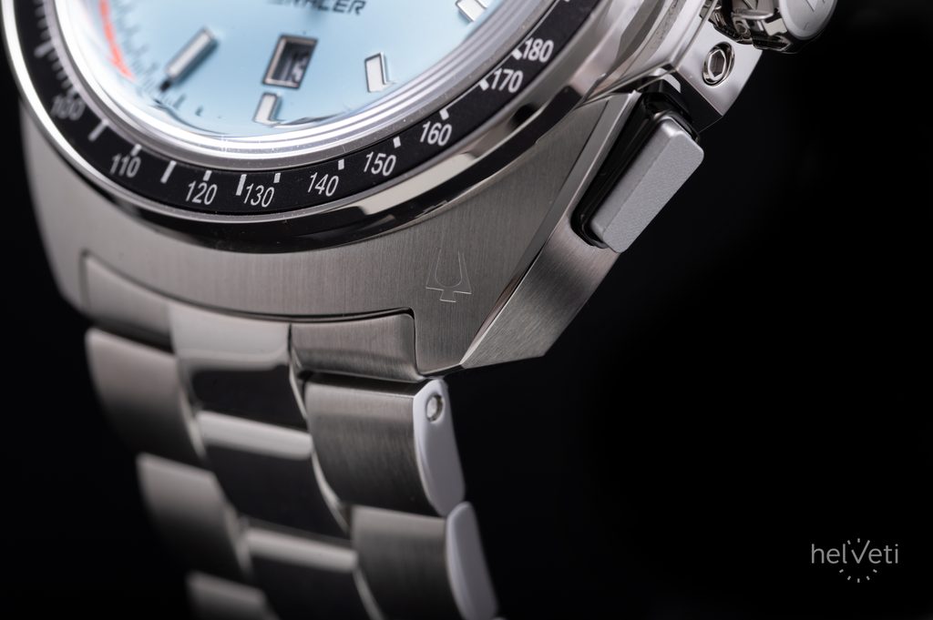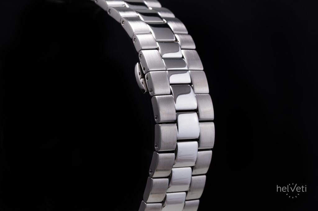 Oceľové puzdro hodiniek inšpirované aerodynamikou automobilov dopĺňa oceľový náramok ukončený motýľovou sponou s nádherným systémom rýchleho uvoľnenia. Model je vybavený ukazovateľom dátumu, 24-hodinovým časom a stopkami. Stopky, ktoré dokážu merať až hodinové intervaly s presnosťou 1/1 sekundy, sa ovládajú tlačidlami na bočnej strane puzdra - horné stopky spúšťa a zastavuje, spodné vynuluje namerané hodnoty. Zobrazenie 24-hodinového času sa potom nachádza na subciferníku na pozícii 3 hodín.