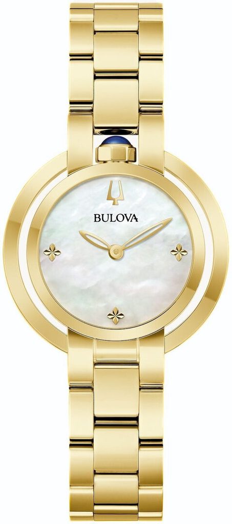 Vďaka svojmu spracovaniu a dizajnu sú hodinky Bulova Rubaiyat 97L181 vhodným doplnkom do spoločnosti, ale aj na každodenné nosenie. Netradičné puzdro a náramok hodiniek sú vyrobené z ušľachtilej ocele so zlatou PVD povrchovou úpravou. Perleťový ciferník, veľmi obľúbený u žien, vhodne dopĺňajú štvorlístkové indexy na pozíciách hlavných hodín. Chráni ho vypuklé zafírové sklíčko s vysokou odolnosťou proti poškriabaniu. Celkový dojem dotvárajú aj skeletové ručičky, modrý kabošon vsadený do korunky umiestnenej na 12. hodine a neobvyklý dizajn puzdra. Hodinky poháňa kvalitný quartzový strojček Miyota.