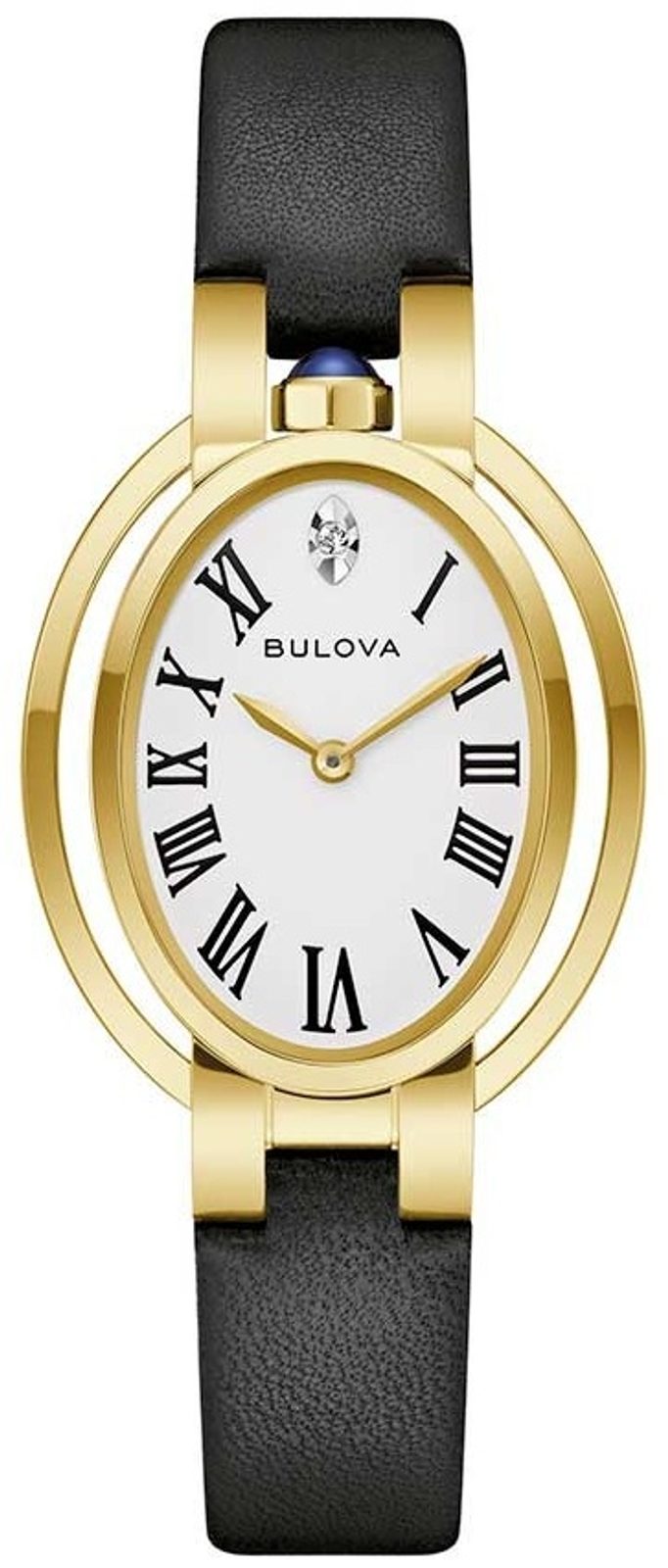 Hodinky na prvý pohľad zaujmú nezvyčajným oválnym puzdrom z nehrdzavejúcej ocele so zlatou IP úpravou, ktoré je zvýraznené ikonickou korunkou umiestnenou netradične na 12. hodine. Je osadená modrým syntetickým kabošonom - charakteristickým prvkom celej kolekcie Rubaiyat. Pôsobivý porcelánovo-biely ciferník dopĺňajú rímske číslice na pozíciách hodín a jemné zlaté ručičky, zatiaľ čo výnimočnosť modelu podčiarkuje diamant v tvare navety na 12. hodine.