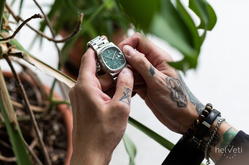 Zelený brúsený ciferník, ktorý podčiarkujú reliéfne indexy na pozíciách hodín, chráni zafírové sklíčko s vnútornou antireflexnou vrstvou. Okrem samotného ciferníka je nezameniteľným prvkom aj vrúbkovaná luneta, ktorá hodinkám dodáva nádych elegancie. Na strieborných ručičkách a bodkách pri hodinových indexoch nájdeme luminiscenciu, ktorá uľahčuje čítanie času za zhoršených svetelných podmienok.