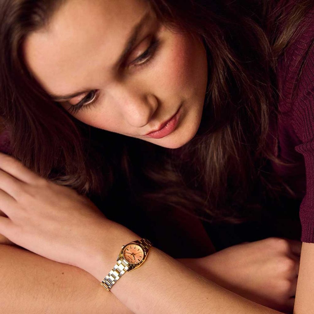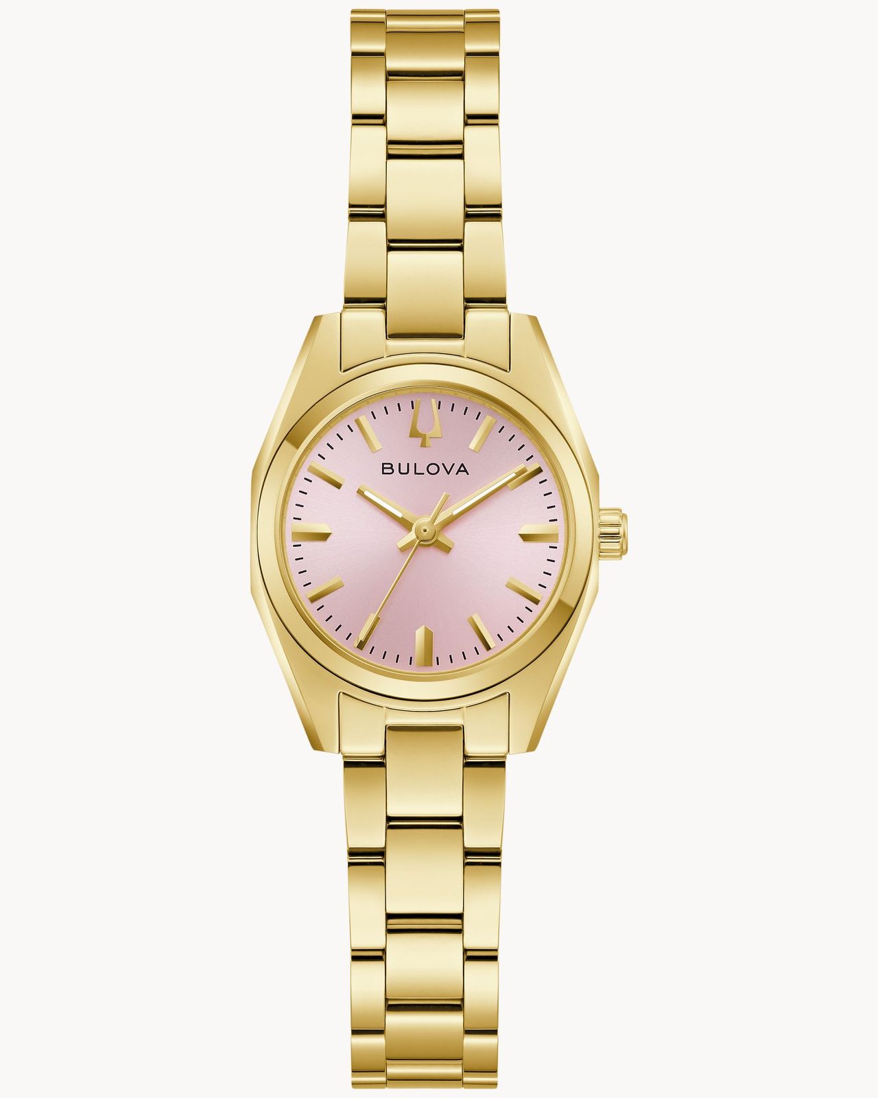Ružový ciferník zaujme nielen svojou farbou, ale aj slnečným efektom, ktorý mu dodáva živosť. Na jeho povrchu vyniknú jemné a elegantné zlaté ručičky a aplikované indexy na pozíciách hodín. Po obvode ciferníka je vytlačená aj minútová stupnica. Ciferník je chránený zafírovým sklíčkom s antireflexnou úpravou, ktoré je vysoko odolné voči poškriabaniu. Ručičky hodiniek sú luminiscenčné, čo uľahčuje čítanie času za zhoršených svetelných podmienok.