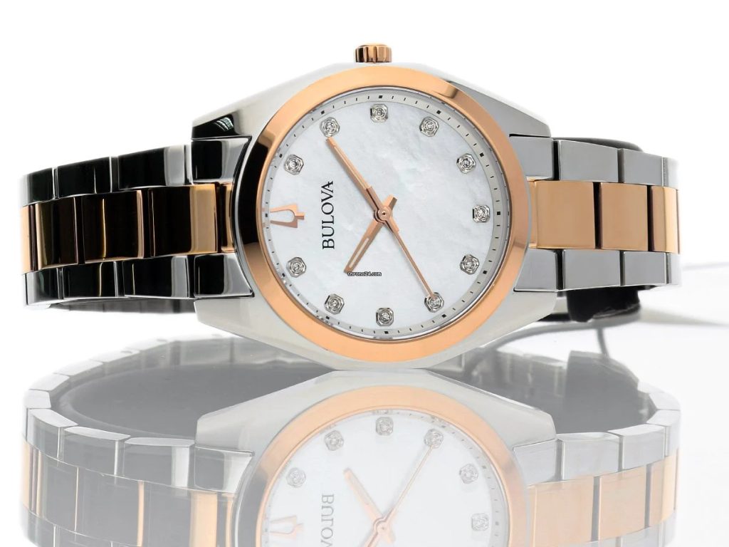 Hodinky Bulova Surveyor 98P207 sú modelom zo série Bulova Diamond. Puzdro a náramok sú vyrobené z nehrdzavejúcej ocele v dvojfarebnom vyhotovení. Jemné a elegantné ručičky z ružového zlata vyniknú na prehľadnom perleťovom analógovom ciferníku, hodinové pozície sú osadené jedenástimi diamantmi. Po obvode ciferníka je vytlačená aj minútová stupnica, ktorá je chránená minerálnym sklom. Ciferník je chránený minerálnym sklom. Ručičky sú luminiscenčné, čo uľahčuje čítanie času pri slabom osvetlení.