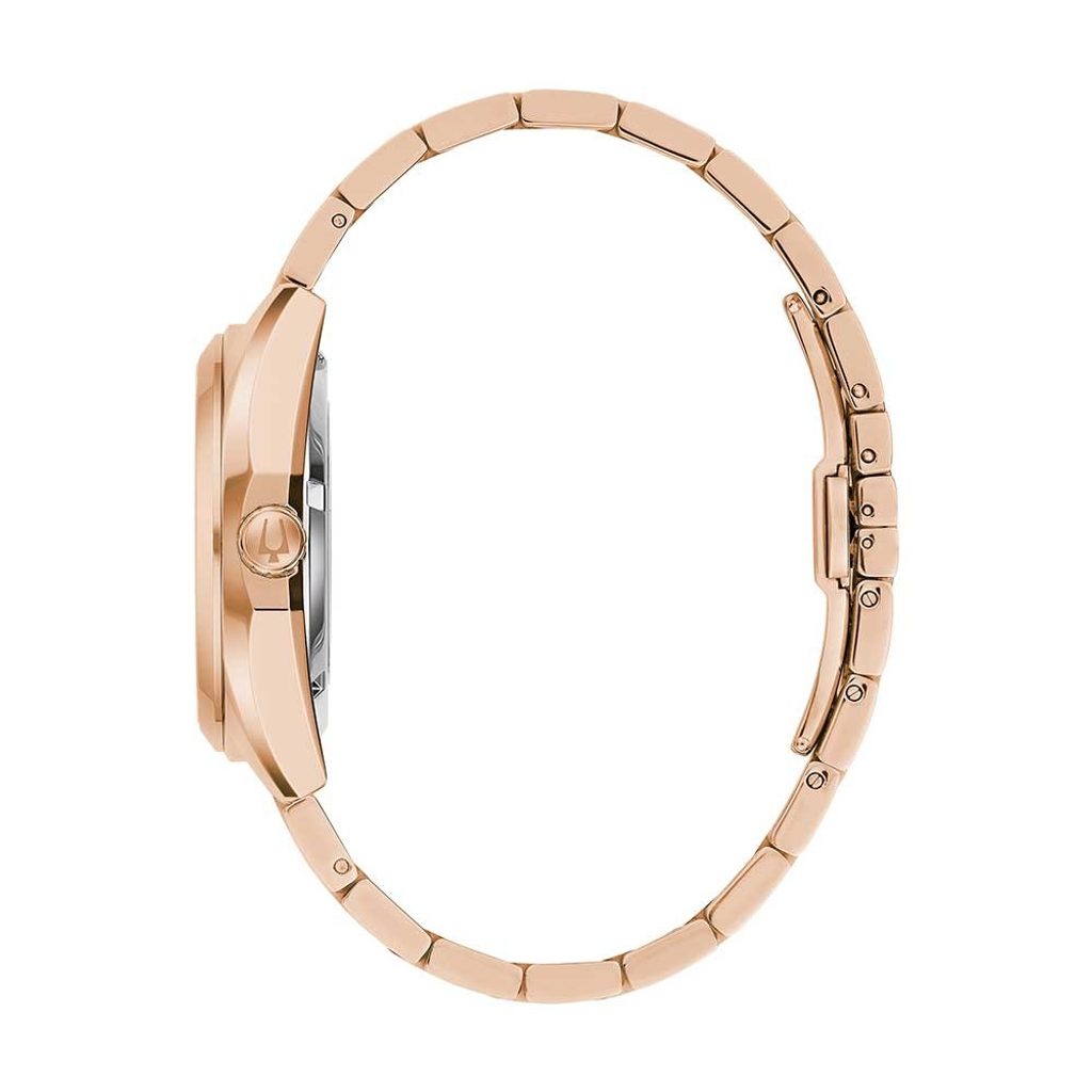Hodinky poháňa samonavíjací mechanický strojček Miyota 8215 s rezervou chodu približne 42 hodín. Strojček ponúka funkciu dátumu, ktorú nájdete na pozícii 3 hodín. Pre lepšiu čitateľnosť je sklíčko nad dátumovkou vybavené zväčšovacou lupou. Činnosť strojčeka je možné sledovať prostredníctvom skleneného eskapu. Puzdro hodiniek a náramok sú vyrobené z ušľachtilej ocele s povrchovou úpravou ružovým zlatom PVD. Náramok je zakončený jemným motýlikom. Hodinky budú skvele vyzerať aj na koženom remienku. Vodotesnosť hodiniek je 30 m, takže vydržia kontakt s vodou pri umývaní rúk, dážď.