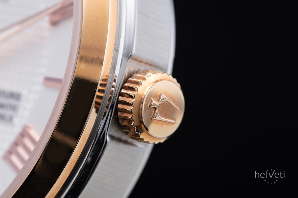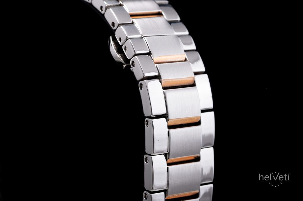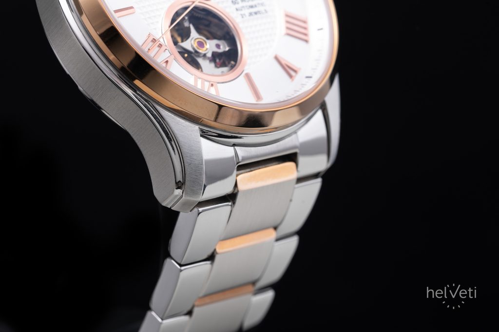 Strieborný ciferník s gilošovaným stredom a brúseným okrajom, ktorý podčiarkujú reliéfne rímske číslice na pozíciách hodín, chráni zafírové sklíčko. Okrem dekorácie je neprehliadnuteľným prvkom zotrvačník strojčeka na pozícii siedmich hodín. Ručičky hodiniek sú luminiscenčné, čo uľahčuje čítanie času za zhoršených svetelných podmienok. Srdcom hodiniek je mechanický strojček Miyota s automatickým naťahovaním a rezervou chodu približne 60 hodín. Chod strojčeka je možné sledovať aj prostredníctvom skleneného eskapitu. Puzdro a náramok hodiniek sú vyrobené z nehrdzavejúcej ocele v dvojfarebnom vyhotovení - t. j. s čiastočnou PVD úpravou. Hodinky majú vodotesnosť 100 m, takže ich nie je potrebné odkladať ani pri povrchovom plávaní.