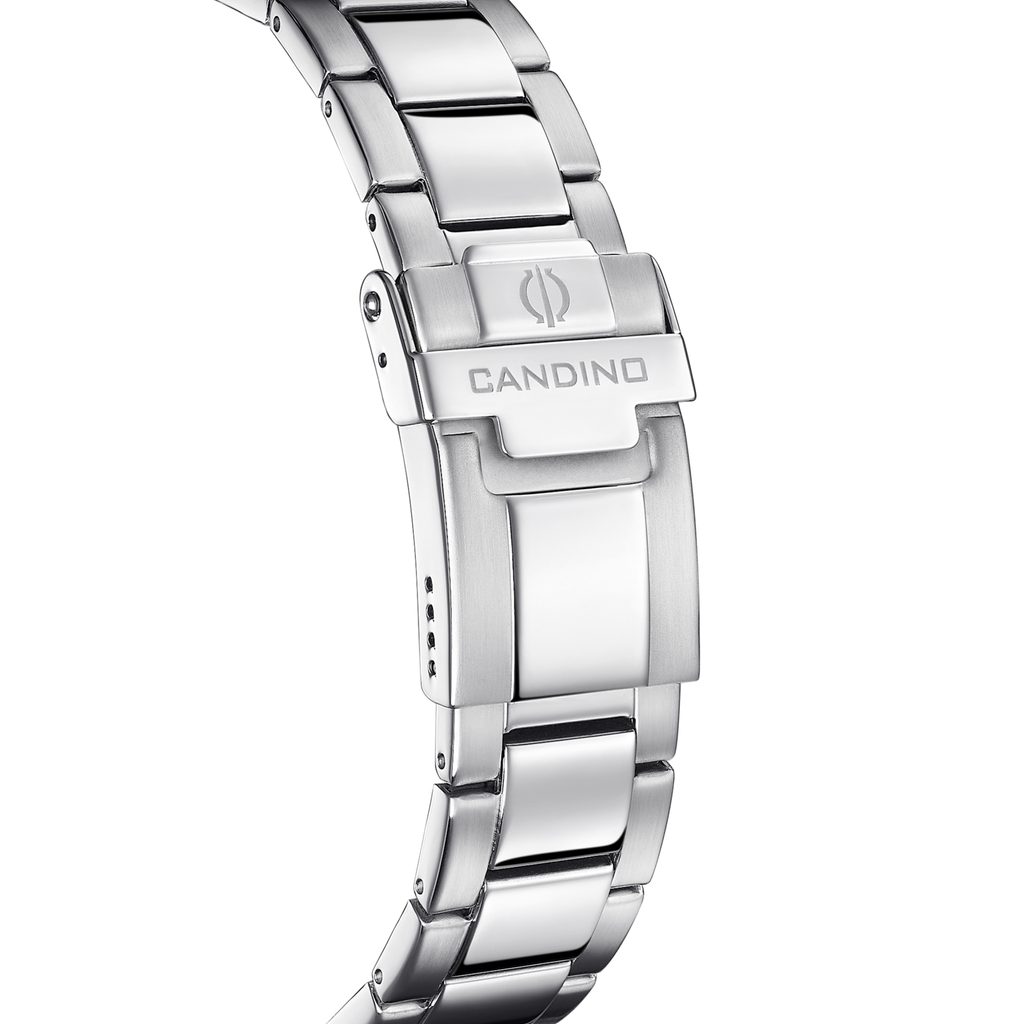 Puzdro hodiniek Candino Gents Chrono Timeless C4757/D je vyrobené z ušľachtilej ocele. Vo vnútri sa nachádza švajčiarsky strojček Ronda 5030.D poháňaný batériou. Disponuje praktickými funkciami, ako sú stopky, ukazovateľ dátumu a tachymeter. Ručičky a indexy sú potiahnuté luminiscenčnou vrstvou Superluminova, ktorá zaisťuje vynikajúcu čitateľnosť aj za zhoršených svetelných podmienok. Všetko chráni zafírové sklíčko odolné voči poškriabaniu.