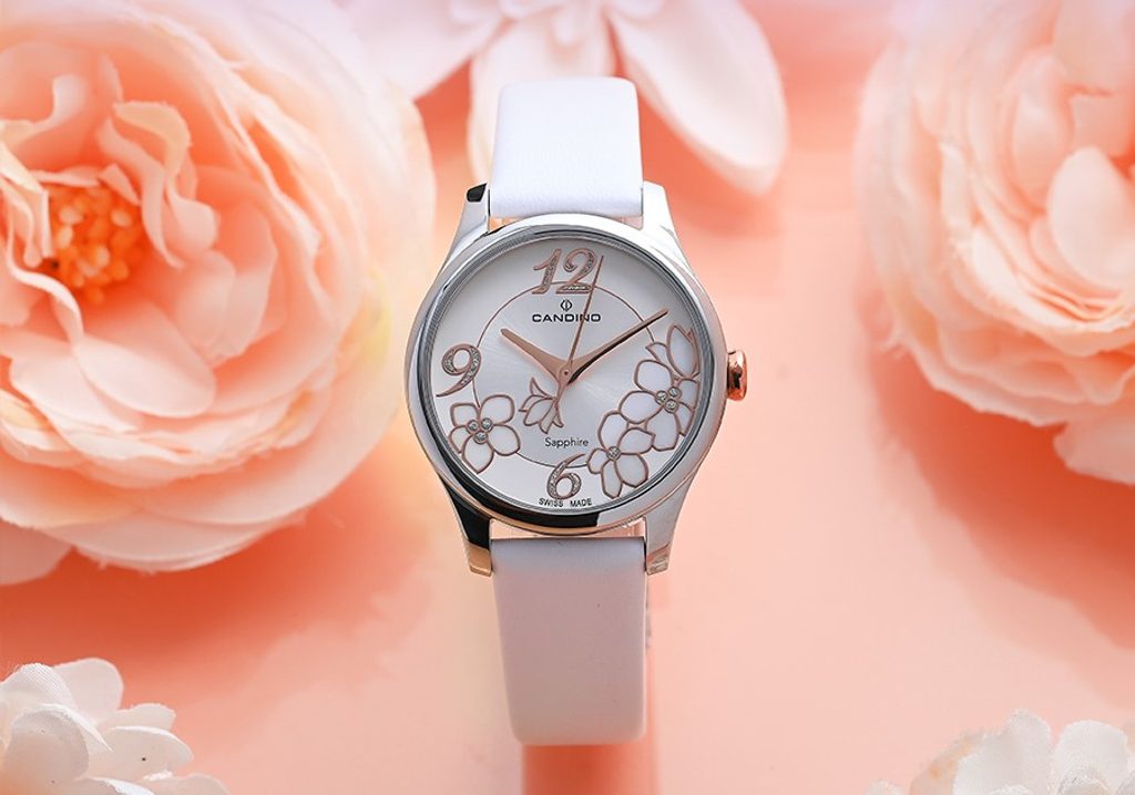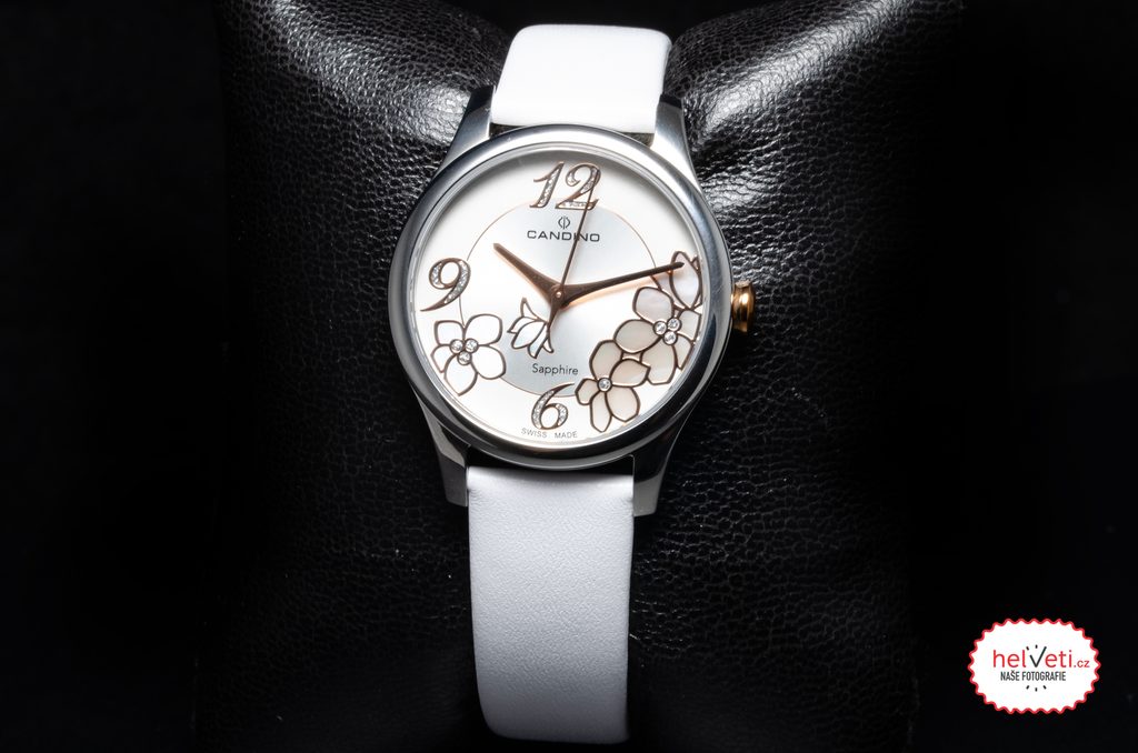 Na hodinkách Vás na prvý pohľad zaujme motív kvetov na číselníku, doplnený o trblietavé kamienky. Všetko chráni zafírové sklo, ktoré je maximálne odolné proti poškriabaniu. Vnútri hodiniek sa skrýva batériový švajčiarsky strojček.