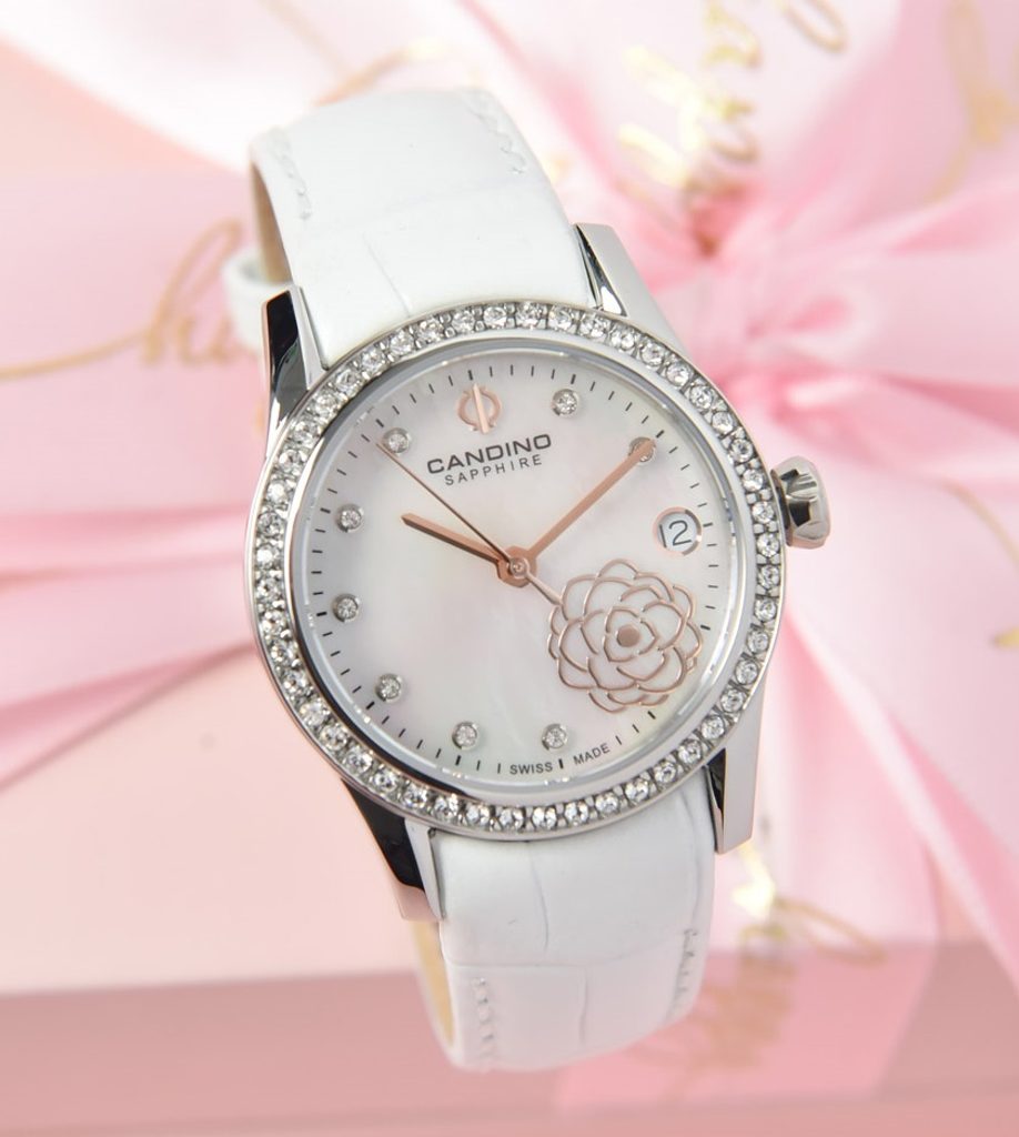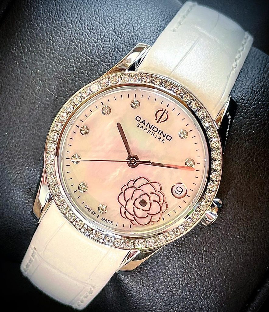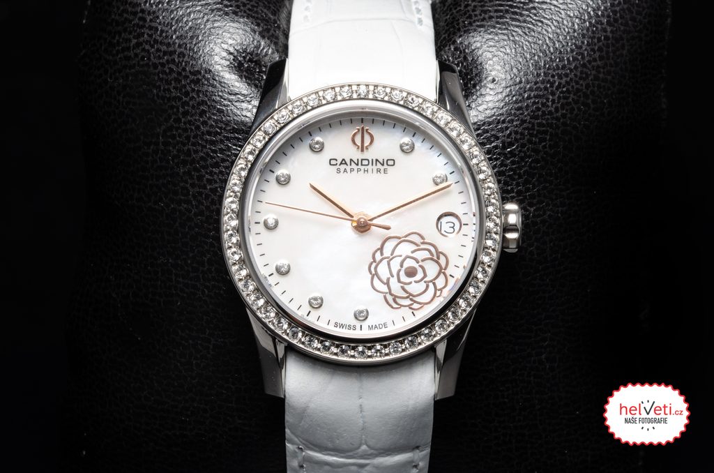 Lesklé kamienky sú tiež zasadené v perleťovom číselníku, kde ich vkusne dopĺňa motív kvetu. Na tradičnej pozícii 3 nájdeme praktický ukazovateľ dátumu. Všetko chráni zafírové sklíčko, ktoré je maximálne odolné proti poškriabaniu. Vnútri hodiniek sa skrýva batériový švajčiarsky strojček.