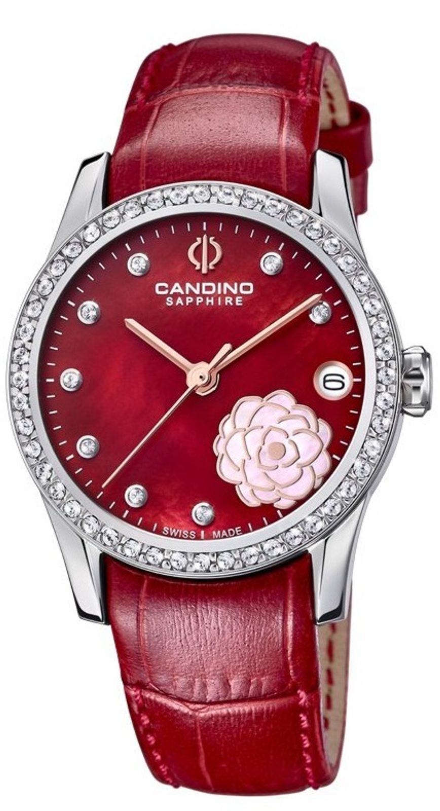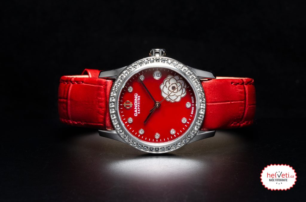 Lesklé kamienky sú tiež zasadené v perleťovom číselníku, kde ich vkusne dopĺňa motív kvetu. Na tradičnej pozícii 3 nájdeme praktický ukazovateľ dátumu. Všetko chráni zafírové sklíčko, ktoré je maximálne odolné proti poškriabaniu. Vnútri hodiniek sa skrýva batériový švajčiarsky strojček.