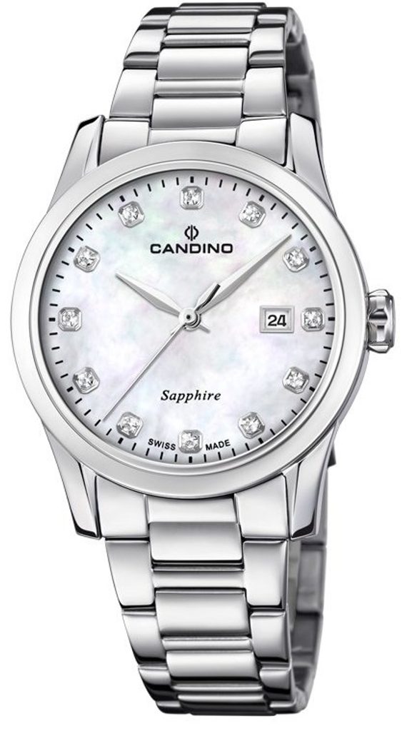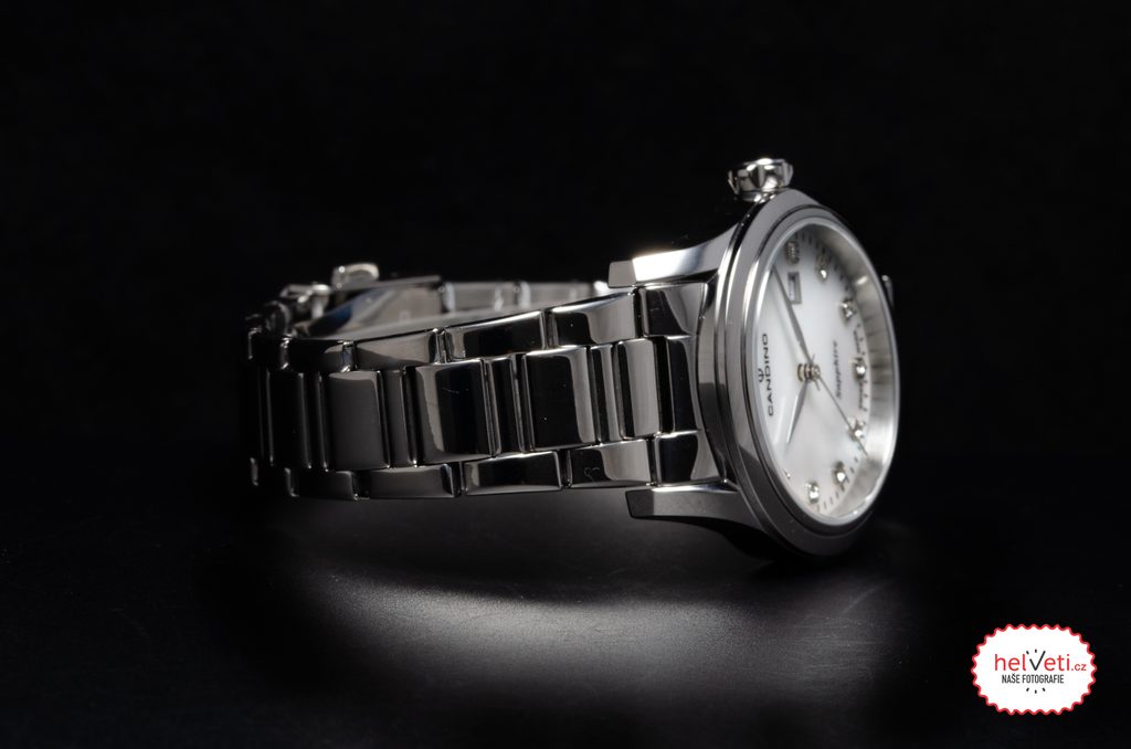 Luxusný vzhľad hodiniek udáva aj puzdro a ťah z ušľachtilej ocele. Na tradičnej pozícii 3 nájdeme praktický ukazovateľ dátumu. Perleťový číselník je doplnený lesklými kamienkami a chráni ho zafírové sklíčko, ktoré je maximálne odolné proti poškriabaniu. Vnútri hodiniek sa skrýva batériový švajčiarsky strojček.