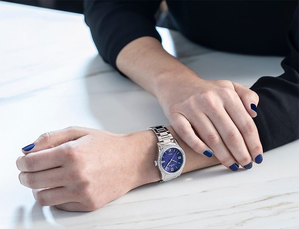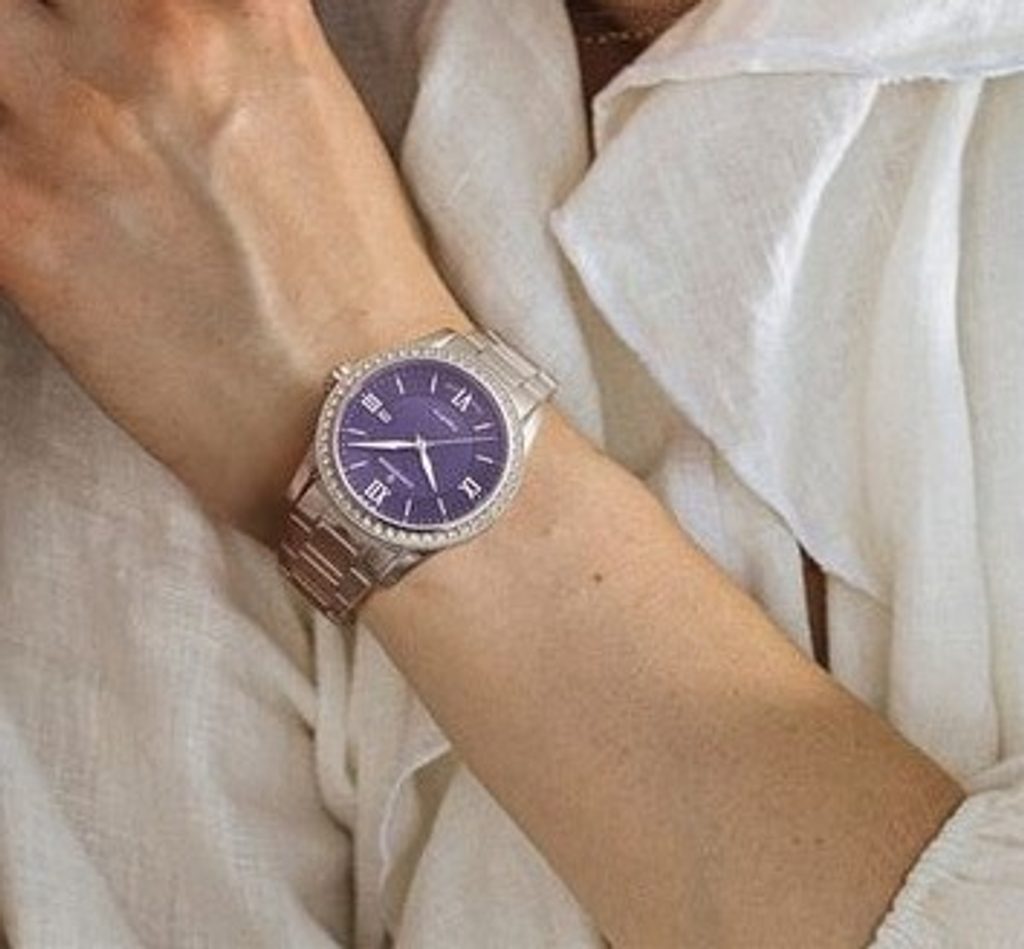 Luxusný vzhľad hodiniek dotvára aj puzdro a remienok z nehrdzavejúcej ocele. Praktická dátumovka sa nachádza na tradičnej pozícii 3. Fialový ciferník dopĺňajú štýlové strieborné ručičky a rímske číslice. Všetko chráni zafírové sklíčko, ktoré je mimoriadne odolné proti poškriabaniu. Vo vnútri hodiniek sa nachádza švajčiarsky strojček poháňaný batériou.