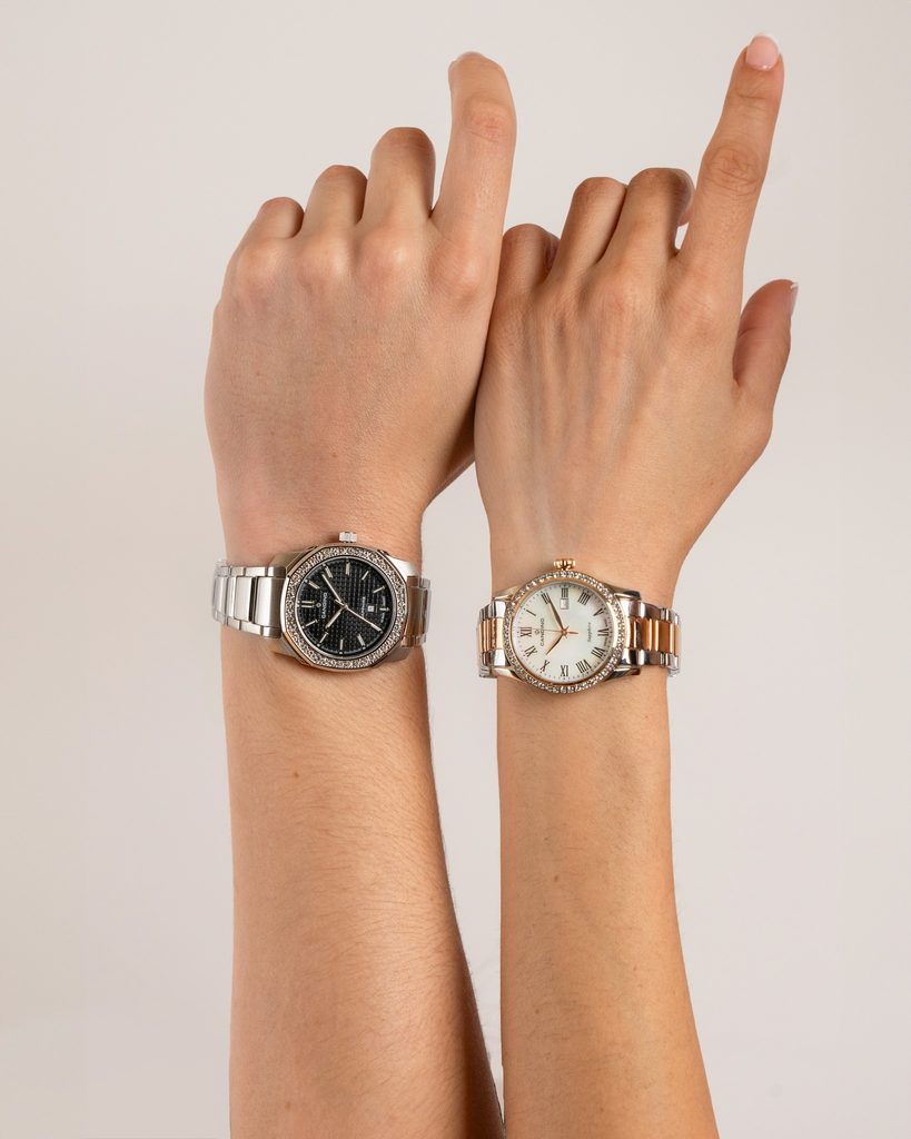 Luxusný vzhľad hodiniek dotvára puzdro a remienok z nehrdzavejúcej ocele s čiastočnou PVD úpravou v ružovom zlate. Na perleťovom ciferníku nájdeme výrazné rímske číslice a tiež ukazovateľ dátumu. Všetko chráni zafírové sklíčko, ktoré je mimoriadne odolné proti poškriabaniu. Vo vnútri hodiniek sa nachádza švajčiarsky strojček poháňaný batériou.