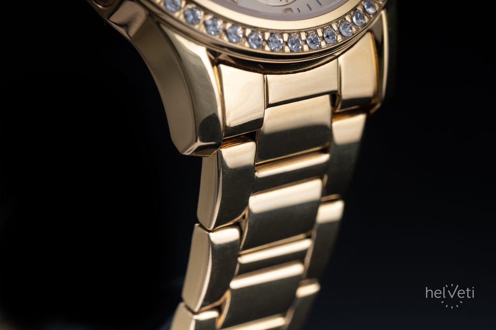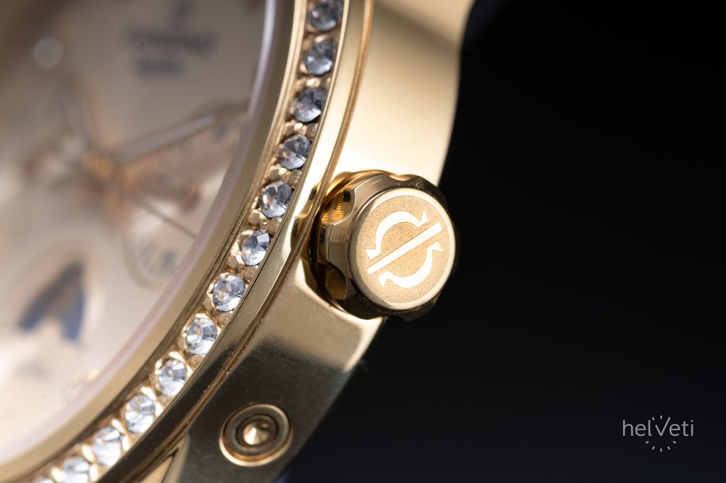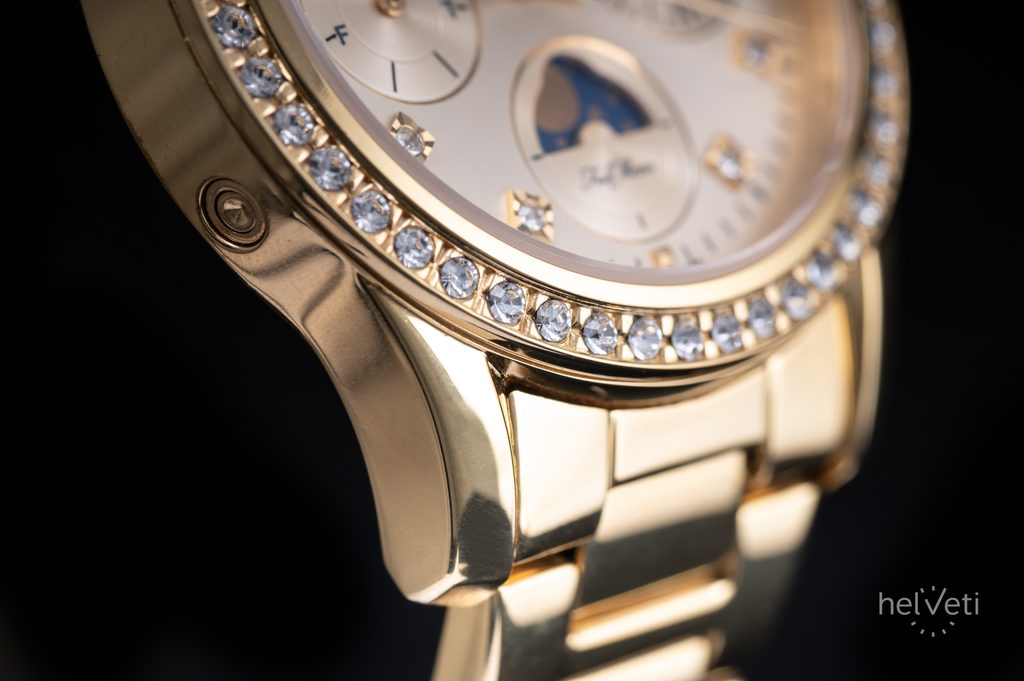 Luxusný vzhľad hodiniek udáva puzdro a strojček z nerezovej ocele so zlatou PVD úpravou. Tieto funkčné hodinky zobrazujú aj deň v týždni, aktuálny deň v mesiaci a majú dokonca ukazovateľ fázy mesiaca. K dispozícii sú aj luminiscenčné ručičky. To všetko je chránené safírovým sklom, ktoré je mimoriadne odolné proti poškriabaniu. Vo vnútri hodiniek sa nachádza aj batéria švajčiarsky strojček.