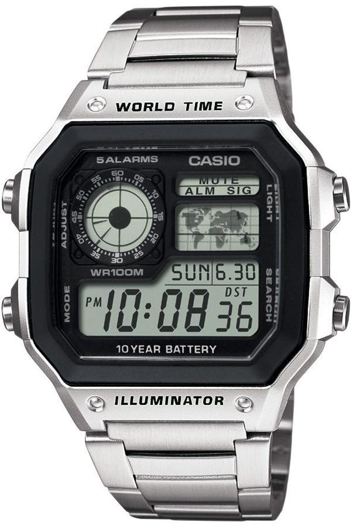 Casio AE 1200WHD-1AV ponúkajú základné funkcie, ktoré využijete pri každodenných bežných a voľnočasových aktivitách. Digitálny displej hodiniek vyniká veľkou prehľadnosťou a zobrazuje klasické údaje, ako je dátum, deň v týždni, stopky. Kalendár hodiniek je plne automatický. Hodinky umožňujú nastaviť čas až na 4 ďalších vybraných miestach v rámci svetového času, navyše nechýba budík ani odpočítavanie. Pre bezproblémovú čitateľnosť v tme a za zhoršených svetelných podmienok sú hodinky vybavené LED osvetlením displeja. Veľkou výhodou modelu je dlhá životnosť batérie až 10 rokov.
