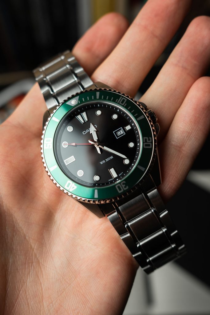 Hodinky Casio Collection MDV 107D-3AV sú vybavené ukazovateľom dátumu na pozícii 3 hodín. Ciferník inšpirovaný potápačskými modelmi vyniká skvelou prehľadnosťou a pôsobí čisto. Oceľové puzdro dopĺňa oceľový náramok so skladacím zapínaním. Minerálne sklíčko chráni prehľadný ciferník hodiniek, na ktorom sú použité výrazné indexy a ručičky. Ručičky a indexy sú navyše luminiscenčné, čo zabezpečuje lepšiu čitateľnosť za zhoršených svetelných podmienok. Sklo lemuje zelená jednosmerná otočná potápačská luneta. Vodotesnosť tohto modelu je 200 m a s hodinkami je možné plávať. Vodotesnosť podporuje skrutkovacia korunka a dierka.
