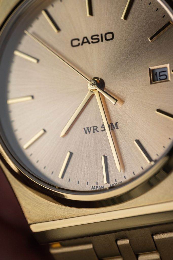 Pozlátený ciferník hodiniek MTP-B145G-9AVEF je pozadím pre tlačenú minútovú stupnicu a zlaté leštené indexy na pozíciách hodín. Chráni ho minerálne sklíčko. Oceľové puzdro hodiniek dopĺňa oceľový náramok, oba s PVD úpravou zo žltého zlata.