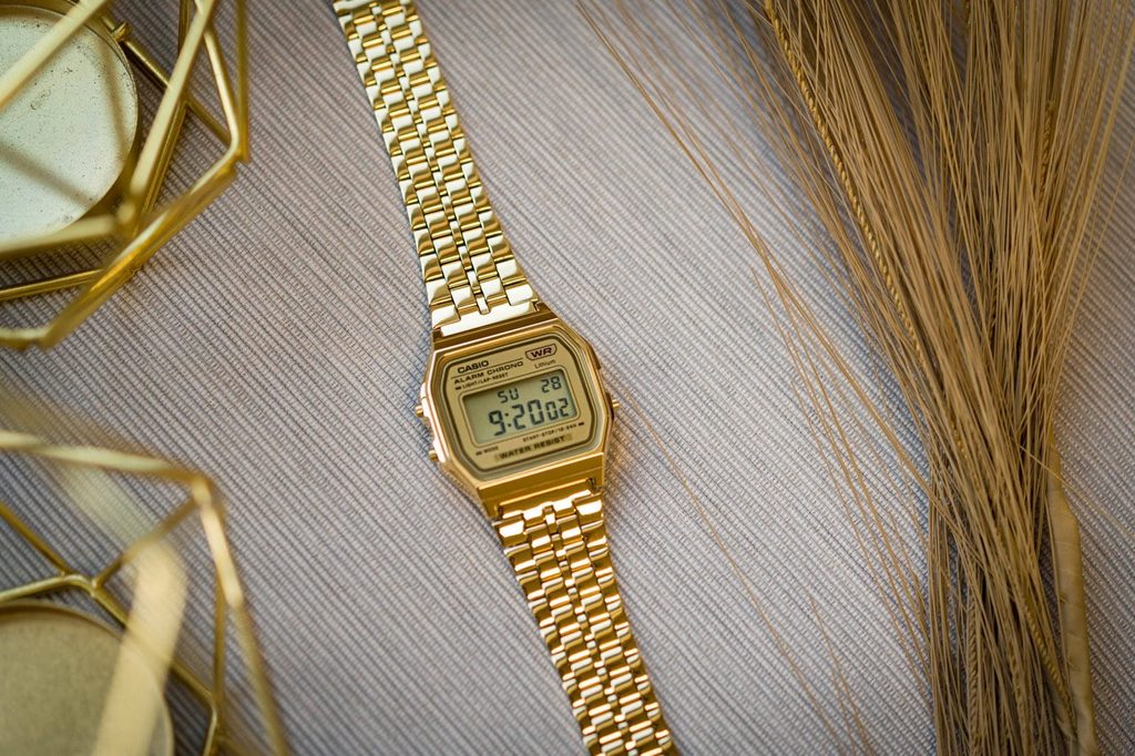 HodinkyCasio A158WETG-9A majú digitálny displej, ktorý zobrazuje čas, dátum, deň v týždni, stopky, budík , 12/24-hodinový formát a osvetlenie displeja LED. Kalendár na hodinkách je plne automatický, takže sa nemusíte starať o jeho časové nastavenie. Plastové puzdro hodiniek dopĺňa jednoduchý kovový náramok, ktorý je obľúbený nielen vďaka svojmu dizajnu, ale aj jednoduchému nastaveniu dĺžky, oboje so zlatou povrchovou úpravou. Displej je chránený plastovým sklom. Priemer puzdra 33,2 mm ho radí medzi menšie hodinky. Hodinky sú odolné voči vlhkosti.