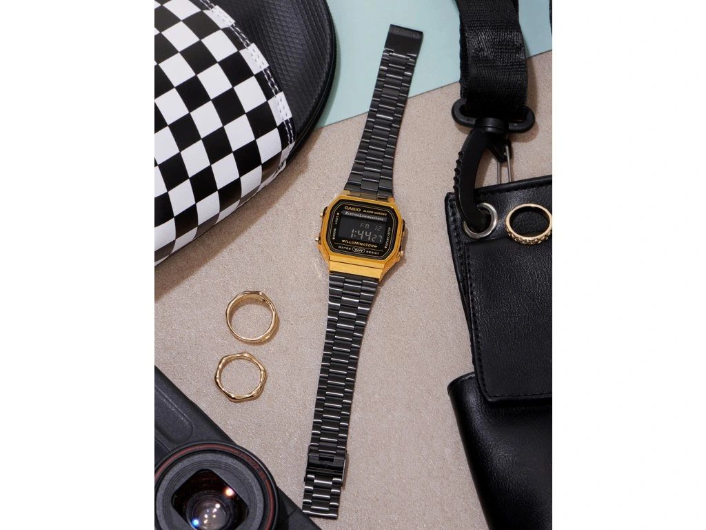 Hodinky Casio Collection Vintage A168WEGB-1B majú reverzný digitálny ciferník, ktorý zobrazuje čas, dátum, deň v týždni, stopky, alarm, 12/24 hodinový formát a LED osvetlenie displeja. Kalendár je na hodinkách plne automatický, takže sa nemusíte starať o jeho nastavenie v priebehu času. Puzdro hodiniek je plastové, remienok je vyrobený z ocele s povrchovou úpravou PVD, ktorá mu dodáva čierny vzhľad. Ciferník je chránený plastovým sklíčkom. Priemer puzdra 36 mm z neho robí hodinky strednej veľkosti. Vodotesnosť tohto modelu je 30 m - vhodná maximálne na ručné umývanie.