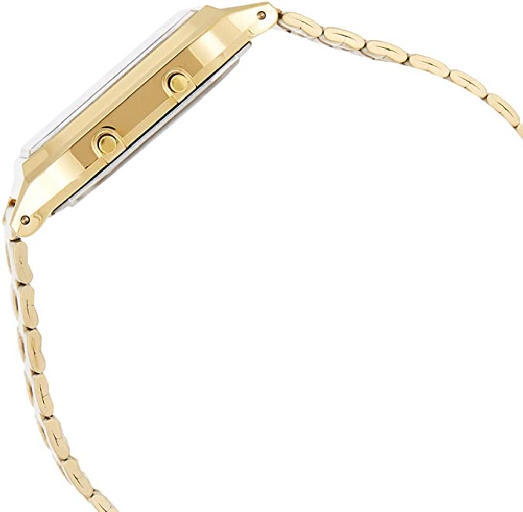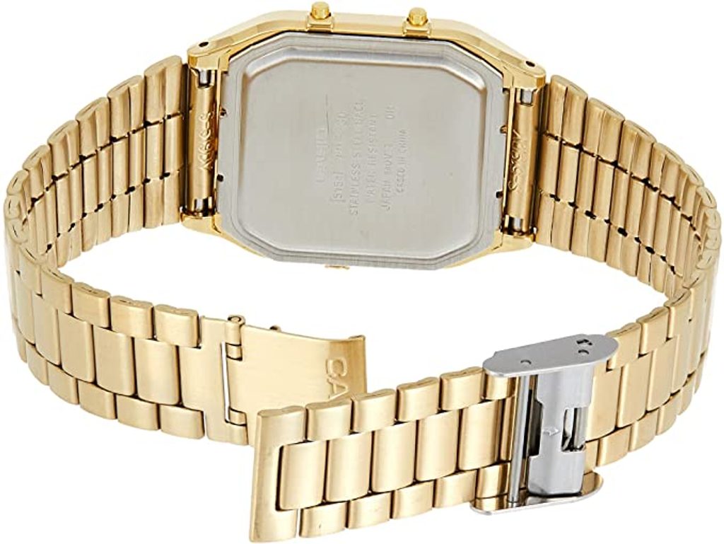 Hodinky Casio AQ-230GA-9DMQ majú digitálny displej, ktorý okrem analógového zobrazenia času zobrazuje aj druhý čas, dátum, deň v týždni, stopky a budík. Kalendár je na hodinkách plne automatický, takže sa nemusíte starať o jeho časové nastavenie. Plastové puzdro hodiniek dopĺňa kovový náramok s povrchovou úpravou IP, ktorý je obľúbený nielen pre svoj dizajn, ale aj pre jednoduché nastavenie dĺžky. Puzdro aj náramok majú zlatú povrchovú úpravu. Displej je chránený plastovým sklom. Priemer puzdra 38,8 x 27,8 mm ho radí medzi menšie hodinky. Vodotesnosť tohto modelu je 30 m - vhodná maximálne na náhodný kontakt s vodou pri umývaní rúk a v daždi.