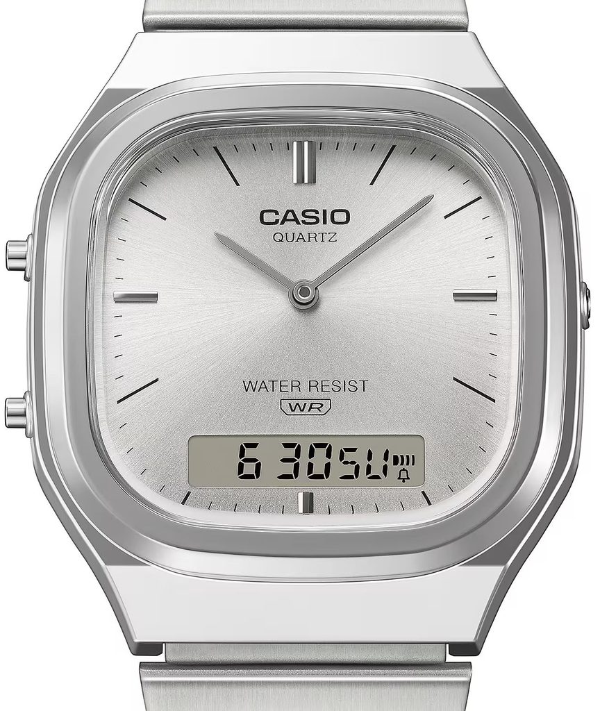 Hodinky Casio AQ 240E-7AEF majú digitálny displej, ktorý okrem analógového zobrazenia času zobrazuje aj druhý čas, dátum, deň v týždni, stopky, budík. Kalendár je na hodinkách plne automatický, takže sa nemusíte starať o jeho nastavenie v priebehu času. Plastové puzdro hodiniek dopĺňa kovový náramok, ktorý je obľúbený nielen pre svoj dizajn, ale aj pre jednoduché nastavenie dĺžky. Puzdro a náramok sú vyhotovené v striebornej farbe. Ciferník je chránený plastovým sklíčkom. Priemer puzdra 40,9 × 35,8 mm radí hodinky medzi menšie. Vodotesnosť tohto modelu je 30 m - vhodná maximálne na náhodný kontakt s vodou pri umývaní rúk a v daždi.
