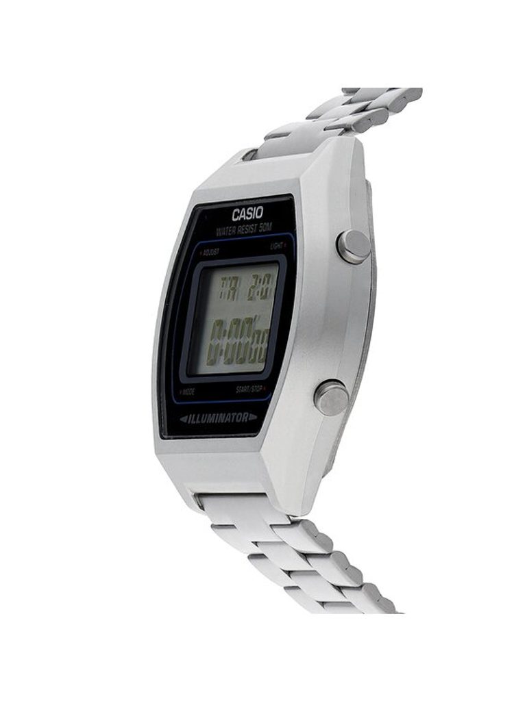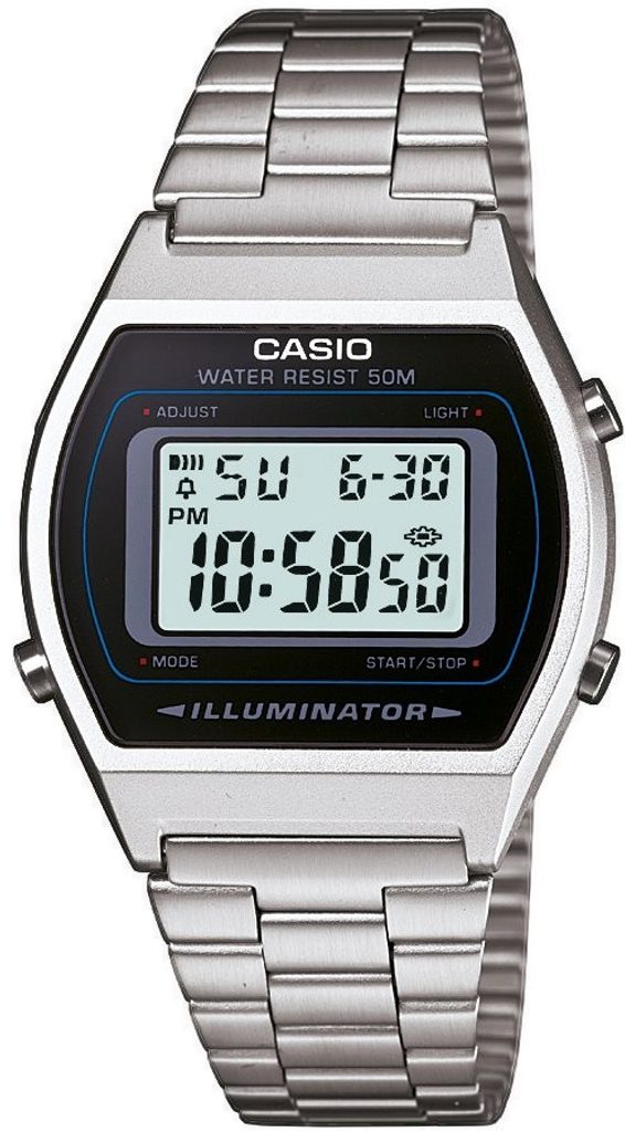 Casio B640WD-1AV majú digitálny displej, ktorý zobrazuje čas, dátum, deň v týždni, stopky (možnosť 1. a 2. miesta a medzičasu), budík, odpočítavanie, 12/24 hodinový formát a nechýba ani funkcia LED osvetlenia displeja. en vás tiež upozorní svojím osvetlením na ukončenie odpočítavania, hodinový signál, nastavený čas budíka atď. Kalendár je plne automatický, takže sa nemusíte starať o jeho nastavenie v priebehu času. Živicové puzdro hodiniek dopĺňa jednoduchý kovový náramok, ktorý je obľúbený nielen pre svoj dizajn, ale aj pre jednoduché nastavenie dĺžky pomocou posuvnej spony. Vďaka tejto kombinácii materiálov dosahujú hodinky veľmi nízku hmotnosť len 49 gramov. Displej je chránený plastovým sklíčkom. Priemer puzdra 35 mm radí hodinky medzi menšie hodinky. Vodotesnosť hodiniek je 50 m - vydržia kontakt s vodou v daždi.