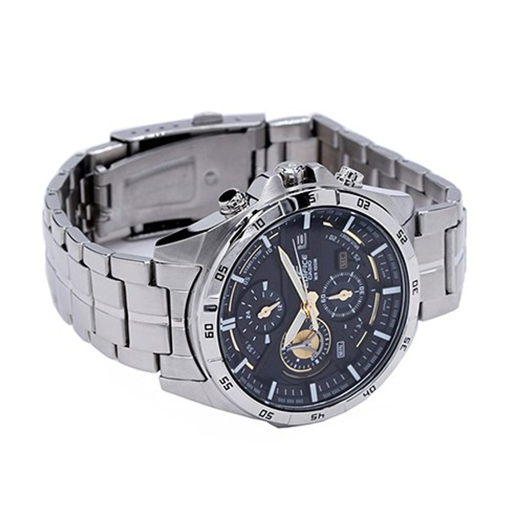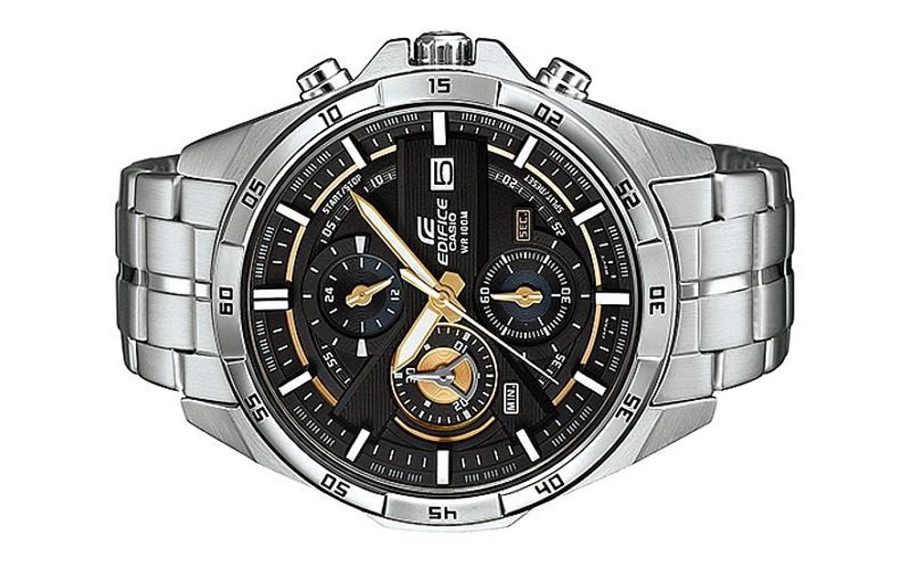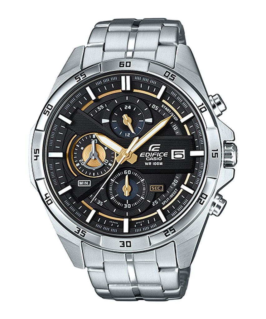 Hodinky Casio Ediface EFR 556D-1A sú vybavené ukazovateľom dátumu na pozícii 3 hodín, 24-hodinovým ukazovateľom času a stopkami, ktoré možno ovládať bočnými tlačidlami - horné stopky spúšťa a zastavuje, zatiaľ čo spodné resetuje namerané hodnoty. Hodinky možno používať na meranie až polhodinových intervalov. Puzdro hodiniek z nehrdzavejúcej ocele vhodne dopĺňa oceľový náramok s oživujúcou leštenou líniou, ktorá prechádza jeho stredom po celej dĺžke a spája sa s leštenou neotáčavou lunetou s minútovými značkami. Priehľadný čierny ciferník je oživený jemnými prvkami zlatej farby a chránený minerálnym sklíčkom. Ručičky a indexy sú potiahnuté luminiscenčnou vrstvou, aby boli ľahšie čitateľné pri slabom osvetlení. Vodotesnosť hodiniek je100 m - vhodná na bežné plávanie alebo šnorchlovanie. S priemerom 48,7 mm sú to veľké hodinky.