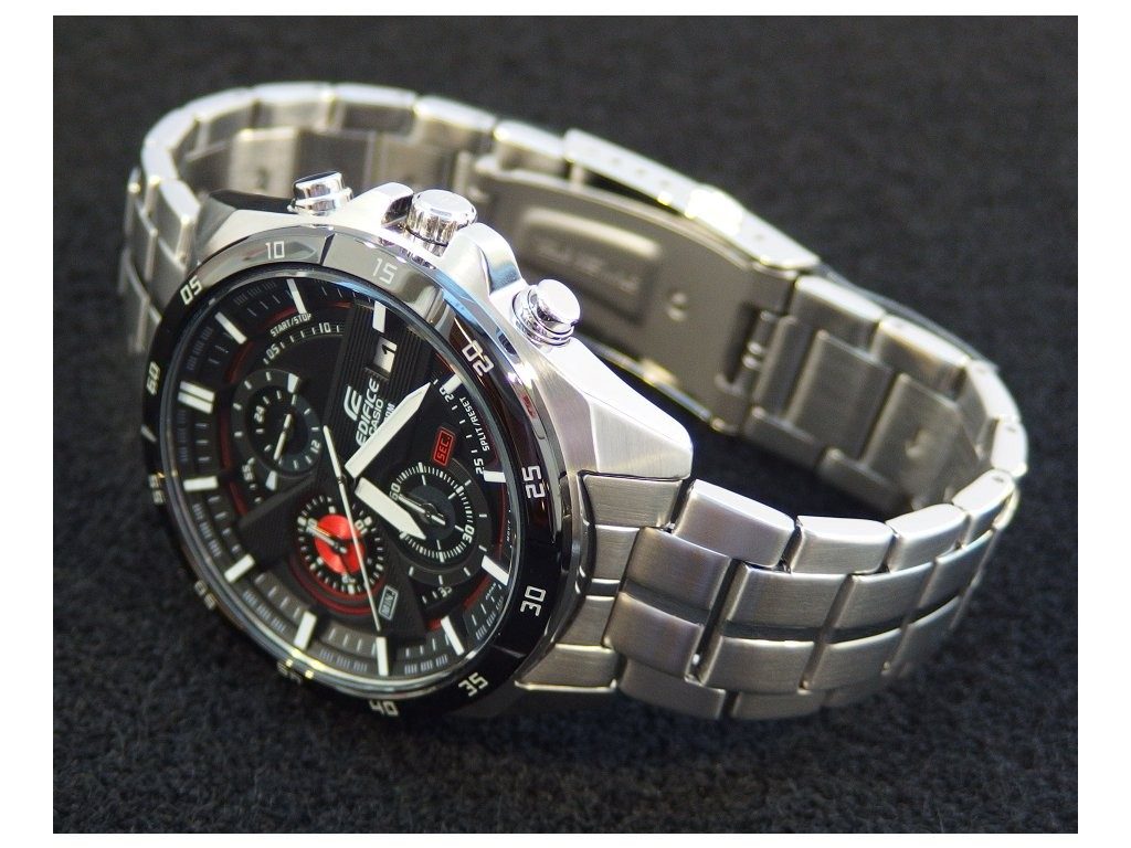 Casio Ediface EFR 556DB-1A disponujú ukazovateľom dátumu na pozícii 3. hodiny, 24 hodinovým zobrazením času a stopkami, ktoré je možné ovládať postrannými tlačidlami - vrchné stopky spúšťa a zastavuje, spodná resetuje namerané hodnoty. S hodinkami je možné merať až polhodinové intervaly. Puzdro hodiniek vyrobené z nerezovej ocele vhodne dopĺňa oceľový náramok s oživujúcou leštenou linkou prechádzajúcou jeho stredom po celej dĺžke a nadväzuje na leštenú neotočnú lunetu s minútovým značením. Prehľadný ciferník čiernej farby oživujú decentné červené prvky, chráni ho minerálne sklíčko. Pre ľahšiu čitateľnosť pri zhoršených svetelných podmienkach sú ručičky a indexy opatrené luminiscenčnou vrstvou. Vodotesnosť hodiniek je 100 m - vhodné na bežné plávanie, či šnorchlovanie. Vďaka priemeru 48,7 mm sa radia medzi veľké hodinky.